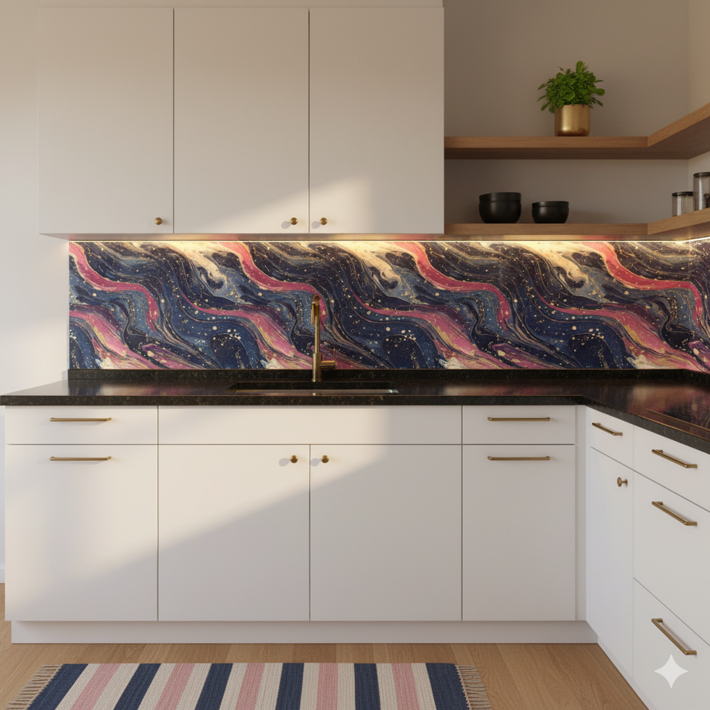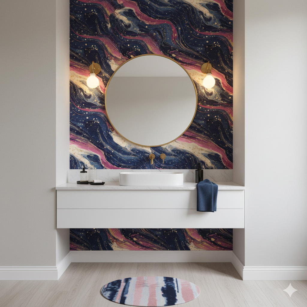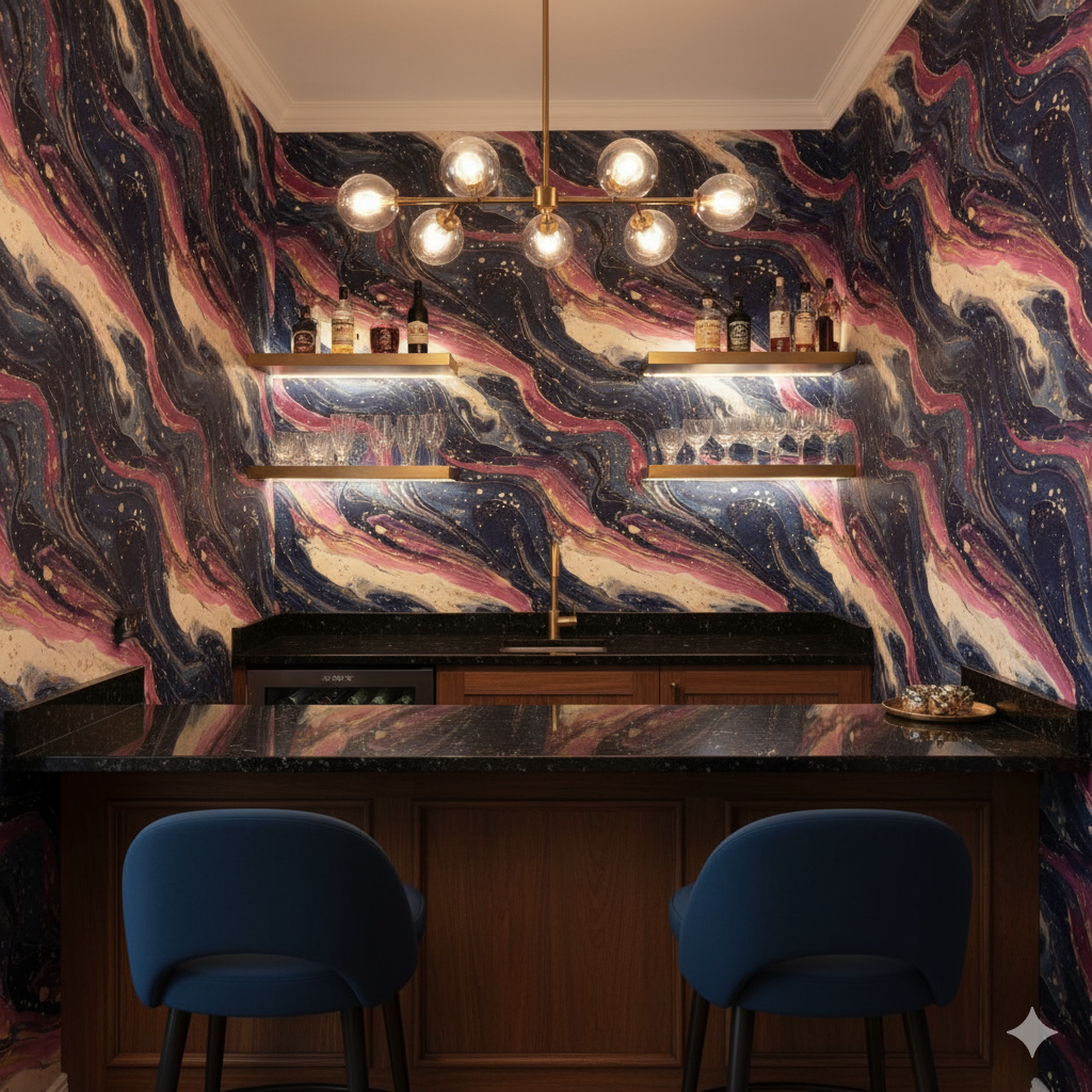 This marbled design flows like liquid stone fused with cosmic skies, where swirls of indigo, magenta, and ivory are streaked with flecks of metallic gold. The movement of the pattern feels both geological and celestial, like polished lapis meeting nebula clouds under starlight. It has a luxurious, almost alchemical energy that brings depth and motion to walls without overwhelming the space. Perfect for a bold powder room, a dramatic dining area, or even as an accent wall in a contemporary loft, this design pairs beautifully with brass fixtures, velvet upholstery, or mid-century modern furniture. The luminous speckles make it equally suited for evening-lit spaces where candlelight or warm bulbs can catch the gold, creating a shimmering effect that changes throughout the day.