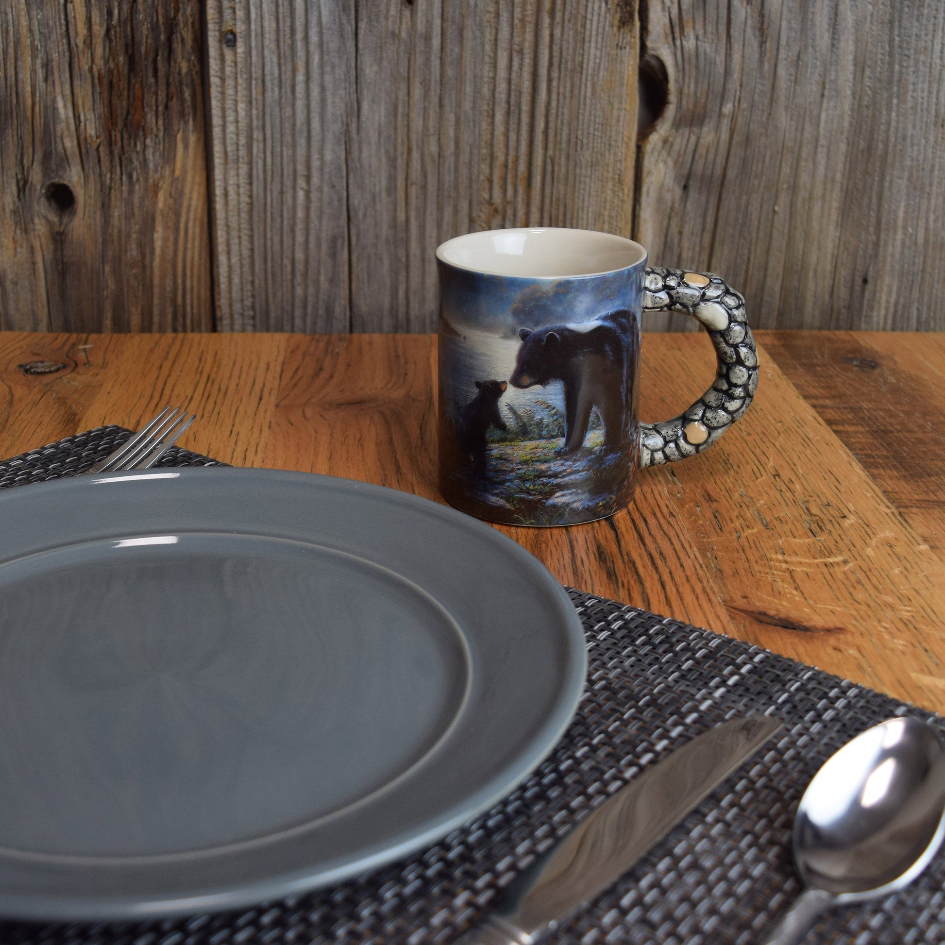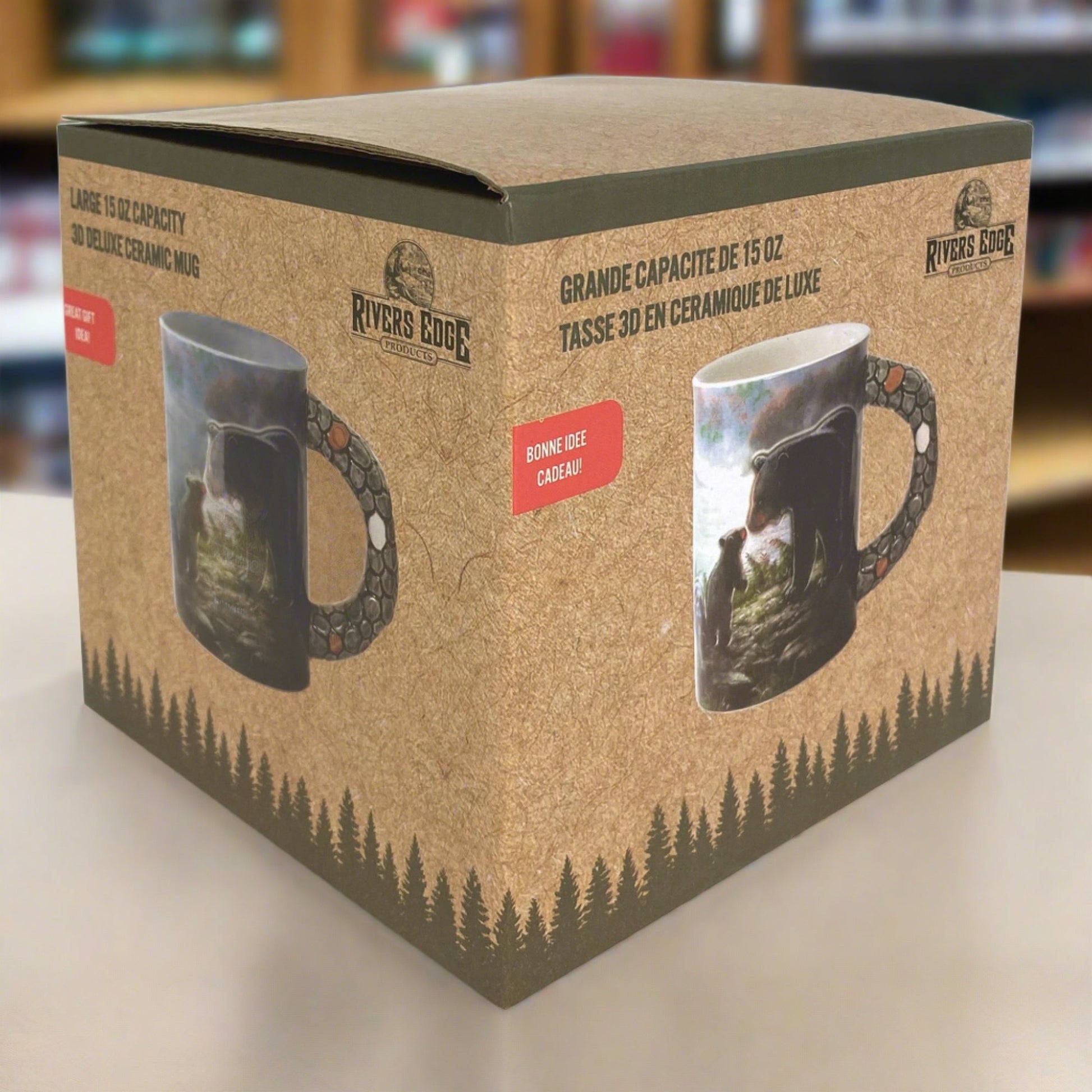 This bear scene 3D ceramic mug by River's Edge Products is ideal for any outdoor enthusiast. Drink your morning coffee, tea, hot chocolate, or other beverage out of this highly detailed mug. It features a three-dimensional design of a mama bear and her cub standing in front of a river that wraps completely around the mug. Its impressive artwork extends to the hand painted handle sculpted to resemble a bunch of stones.