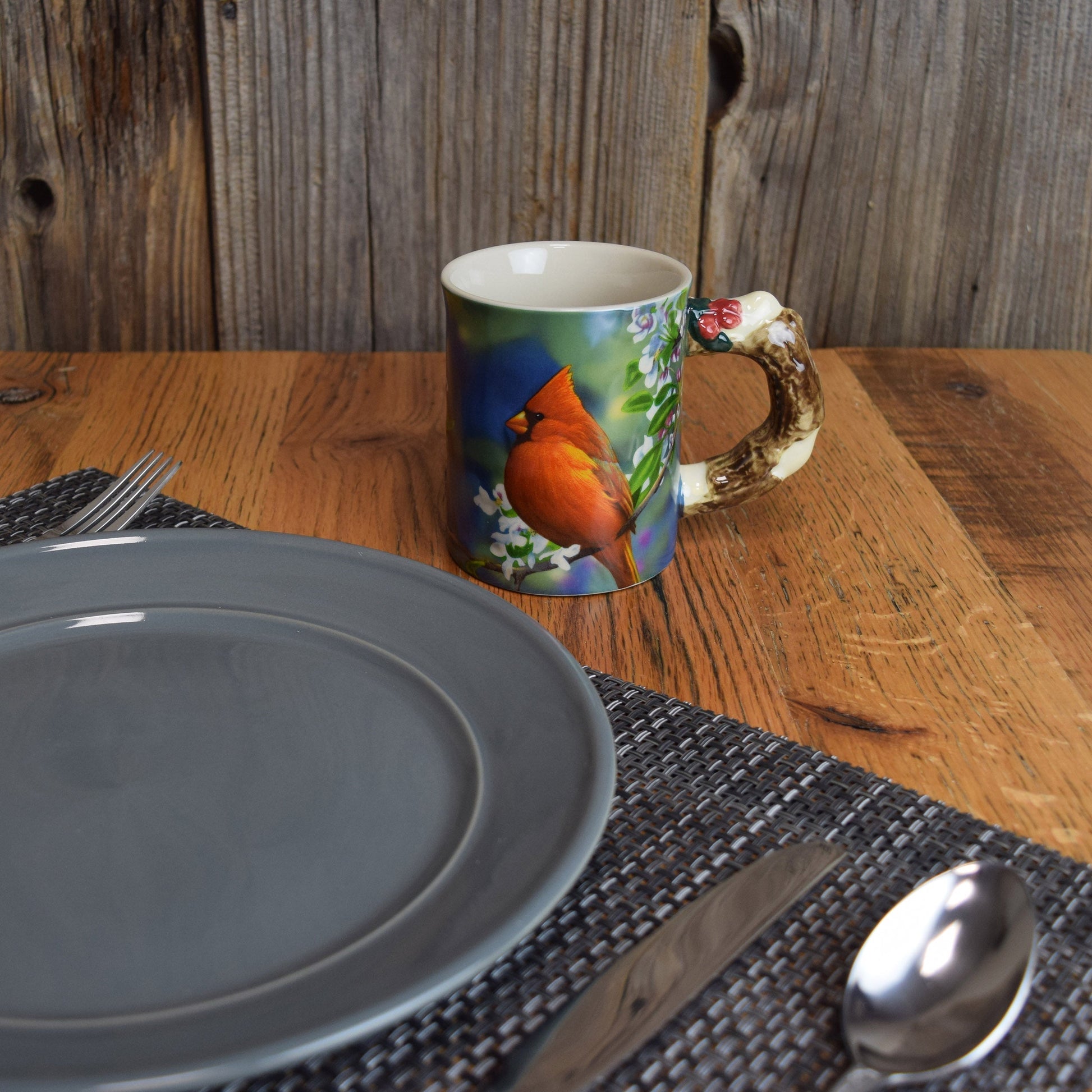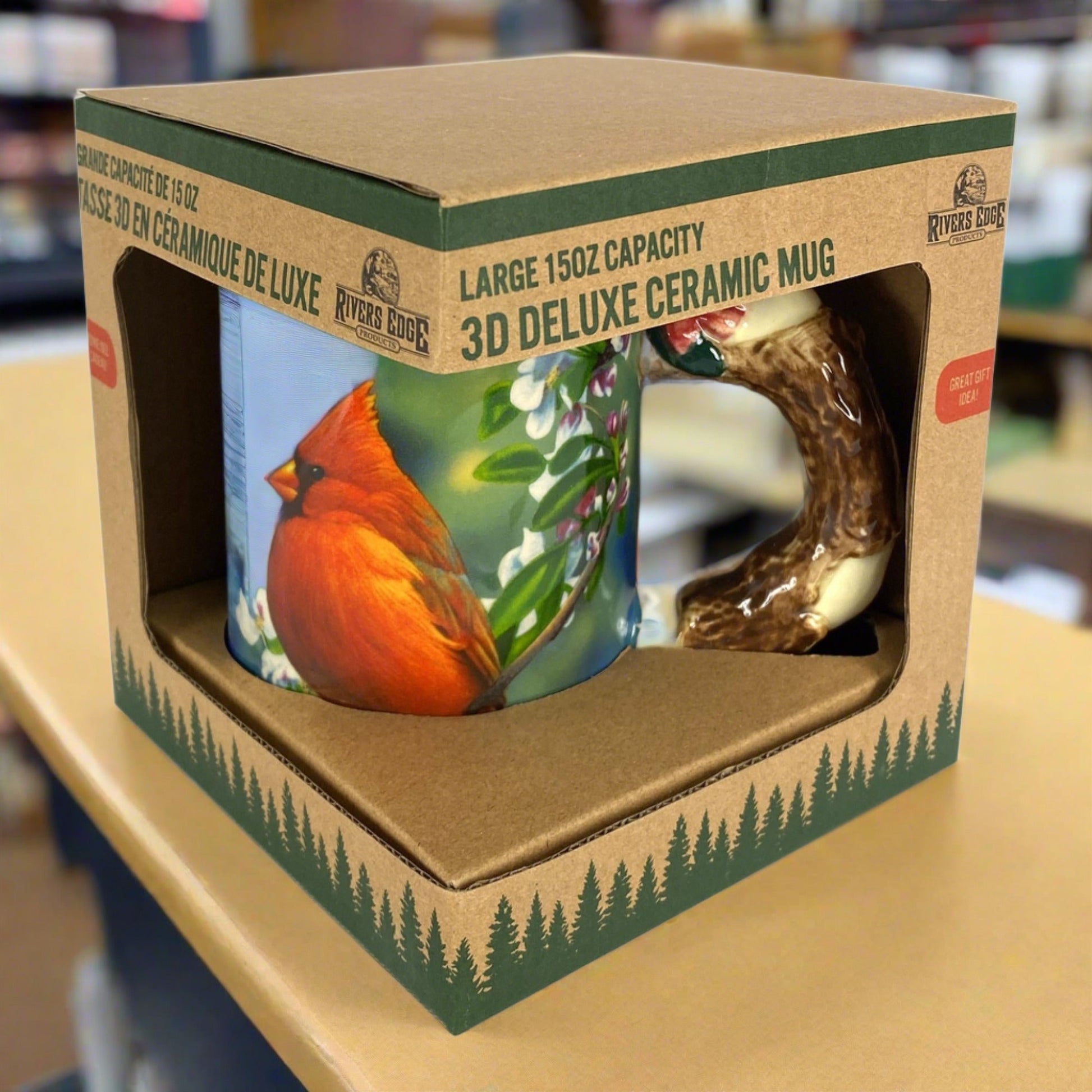 This cardinal 3D ceramic mug by River's Edge Products is ideal for any outdoor enthusiast. It features a three-dimensional design of a cardinal sitting on a flowering tree branch that wraps completely around the mug. Its impressive artwork extends to the hand painted handle sculpted to resemble a tree branch. This mug will make a great gift for your outdoors-loving friends, family members, or colleagues.