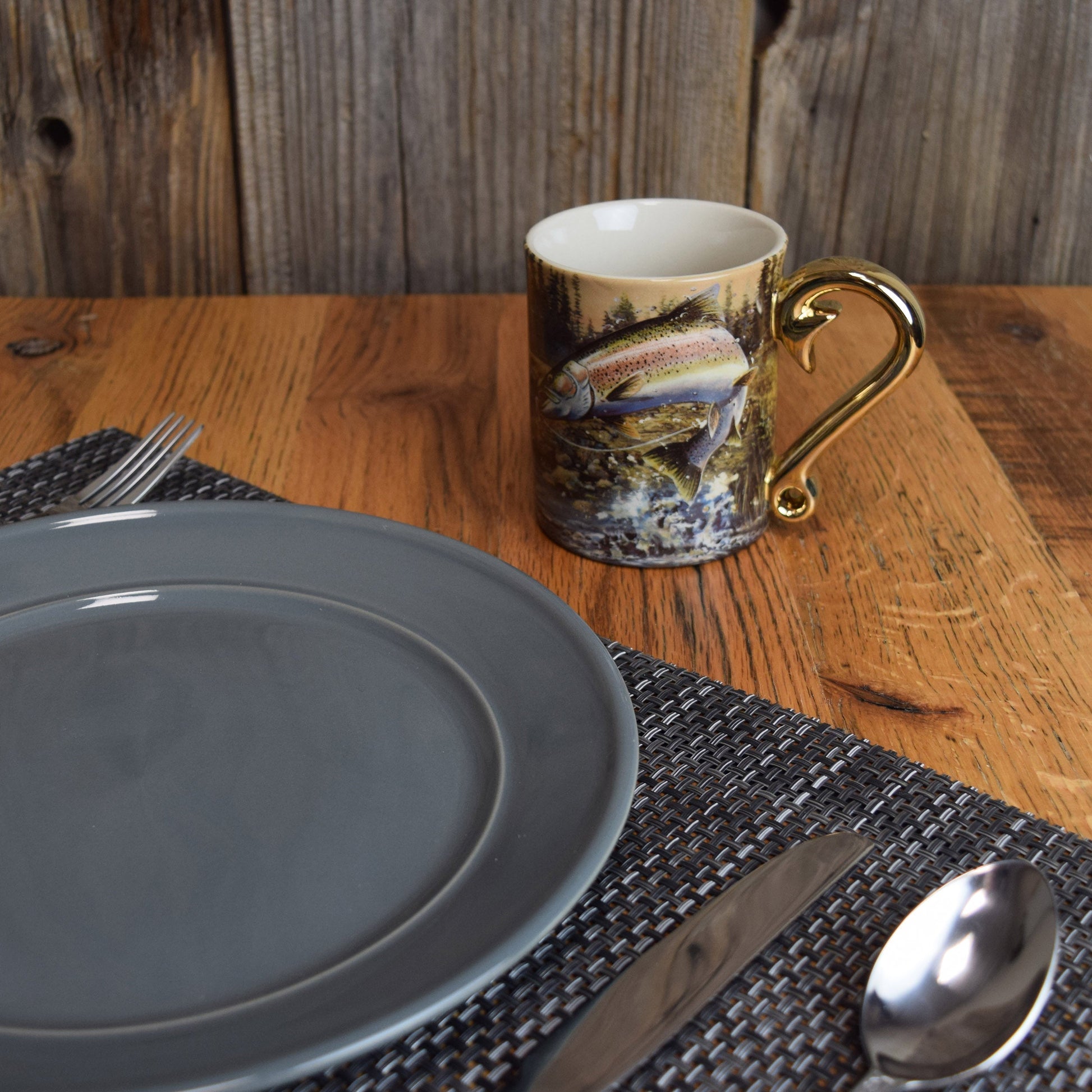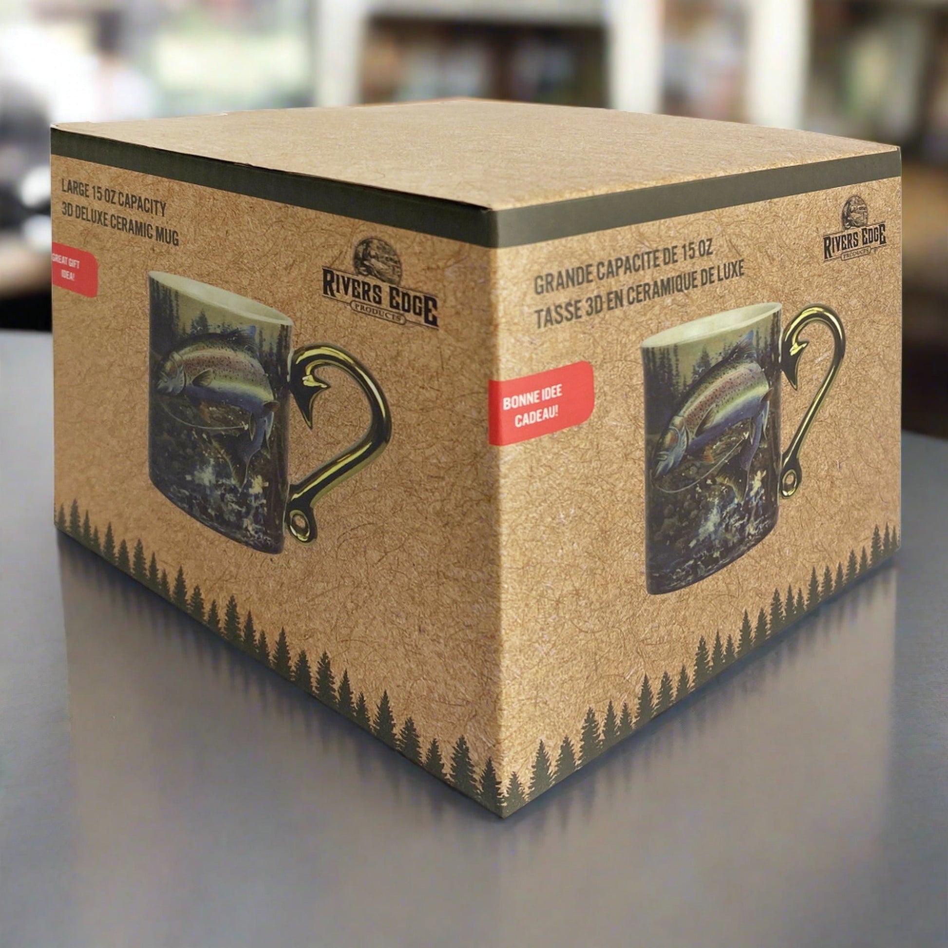 This rainbow trout scene 3D ceramic mug by River's Edge Products is ideal for any outdoor enthusiast. It features a three-dimensional design of a rainbow trout leaping out of the water that wraps completely around the mug. Its impressive artwork extends to the hand painted handle sculpted to resemble a shiny brass fish hook.