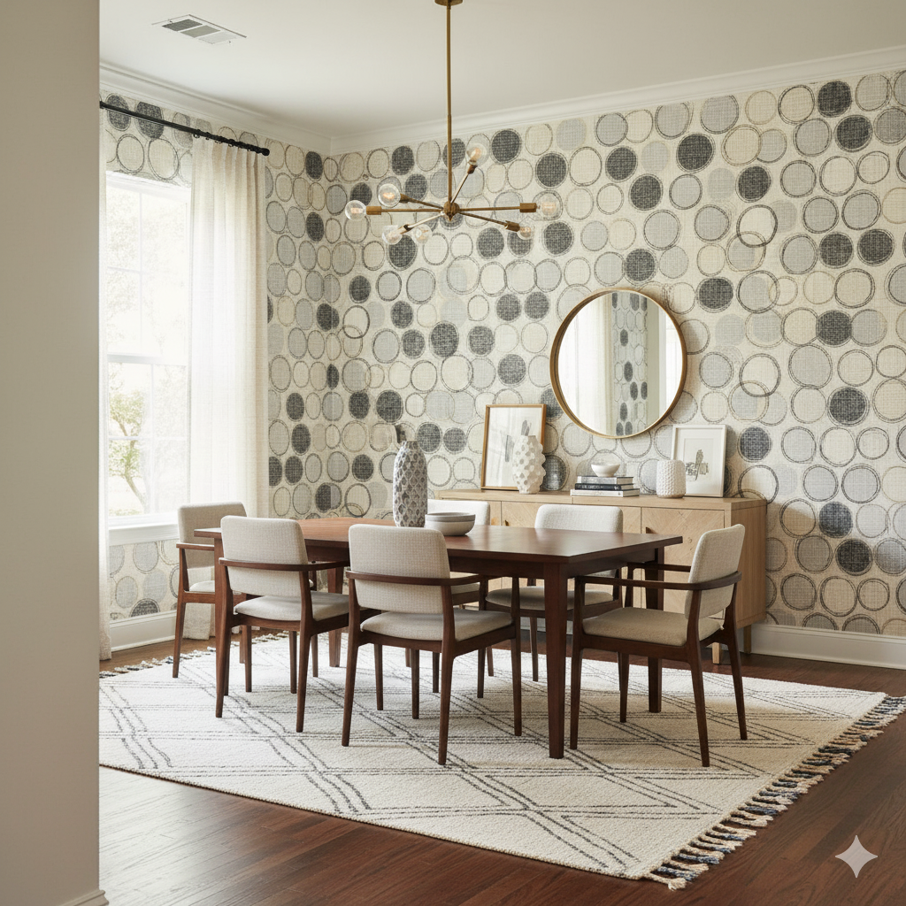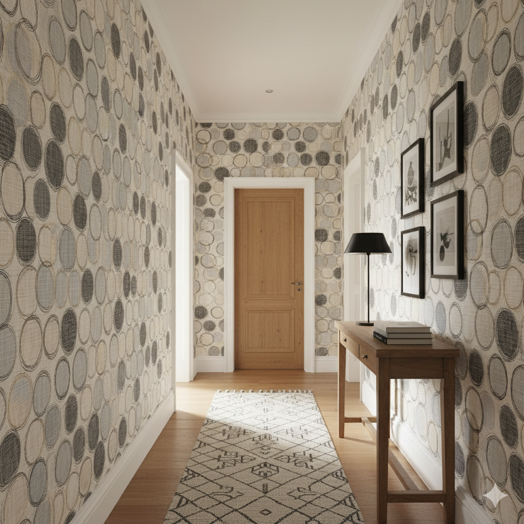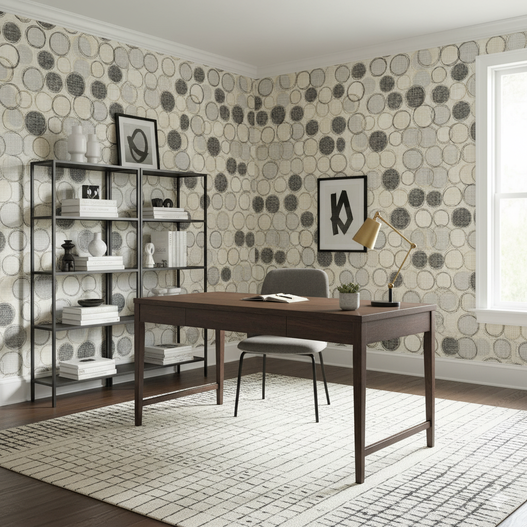 Overlapping sketch-style circles in muted tones of charcoal, taupe, ivory, and sand create a playful yet urban rhythm. The rough pencil texture against a linen-like backdrop makes the pattern feel both hand-drawn and industrial. Its modernist geometry adds energy without overwhelming, making it ideal for loft apartments, creative studios, or accent walls in dining spaces. A perfect fit for those looking for a contemporary yet artistic statement that bridges minimalism with character.