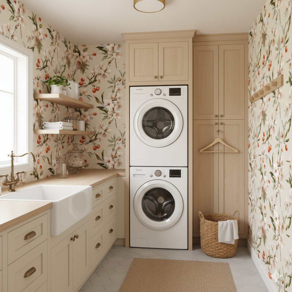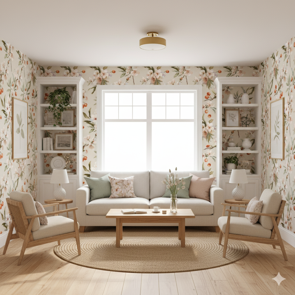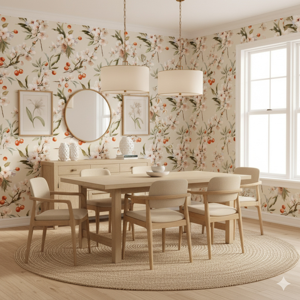 Delicate apple and cherry blossoms in pale blush, ivory, and soft cream unfold beside clusters of small red fruits, all painted against a sandy beige backdrop. The design captures the lush moment of spring when flowering trees begin to fruit, blending floral delicacy with orchard abundance. This wallpaper works beautifully in kitchens, dining spaces, or conservatories, offering both freshness and warmth. Its elegant detailing also suits boutique cafés or romantic, European-inspired interiors.
