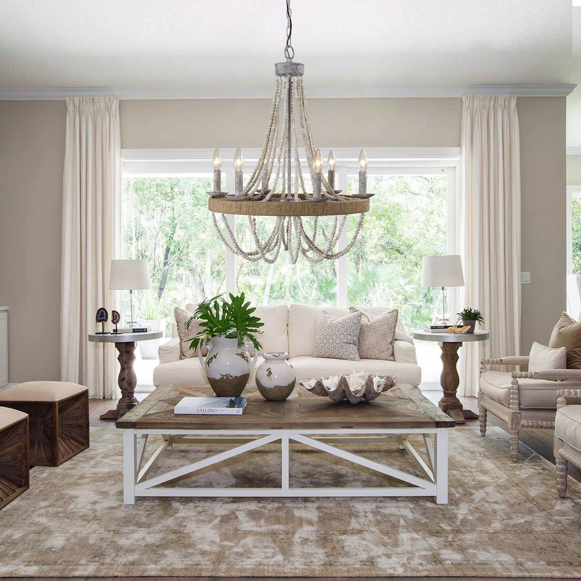 This farmhouse chandelier is neither large nor small. Its standard size makes it suitable for most places. The most fascinating thing is it is made with neutral-toned wood beads and a rustic iron on the metal accents. Designers often say lighting is the jewelry of the house decor and this piece is absolutely a distinctive statement necklace.