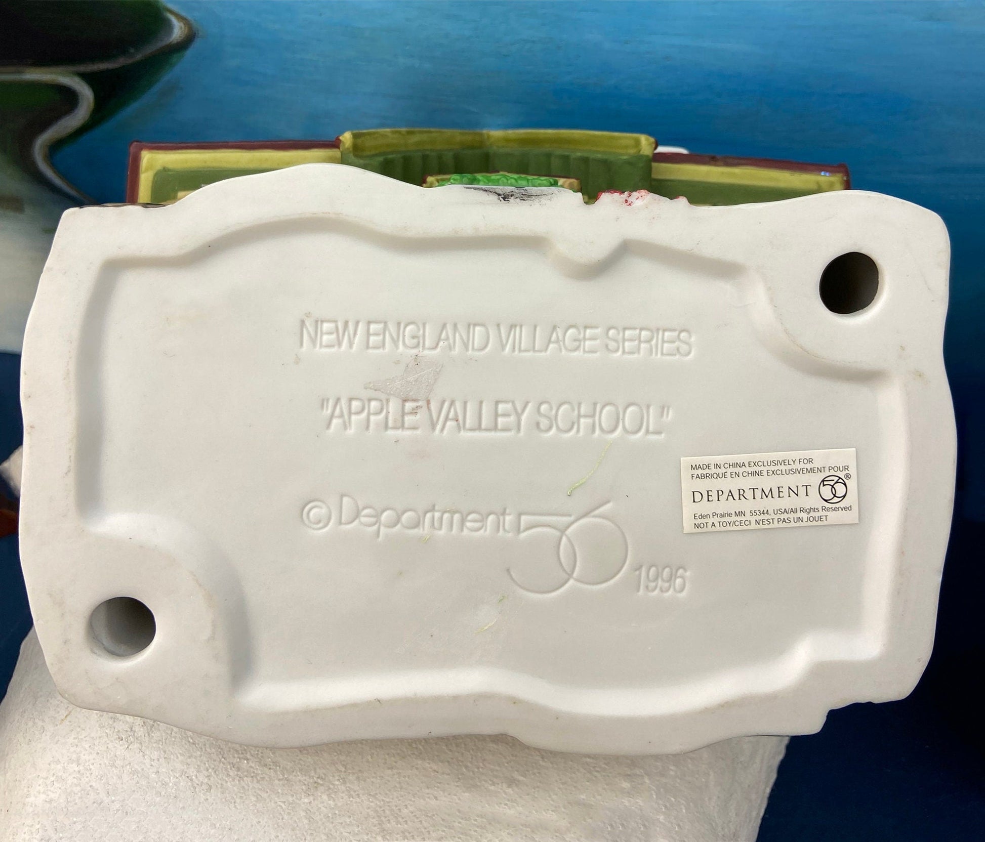 Christmas Department 56 / Apple Valley School / New England Village Series / Hand Painted Porcelain Building with Lights. Made in 1996. It has many beautiful details. Comes with light kit. It is marked by manufacturer. Trees in the photo are for presentation only.