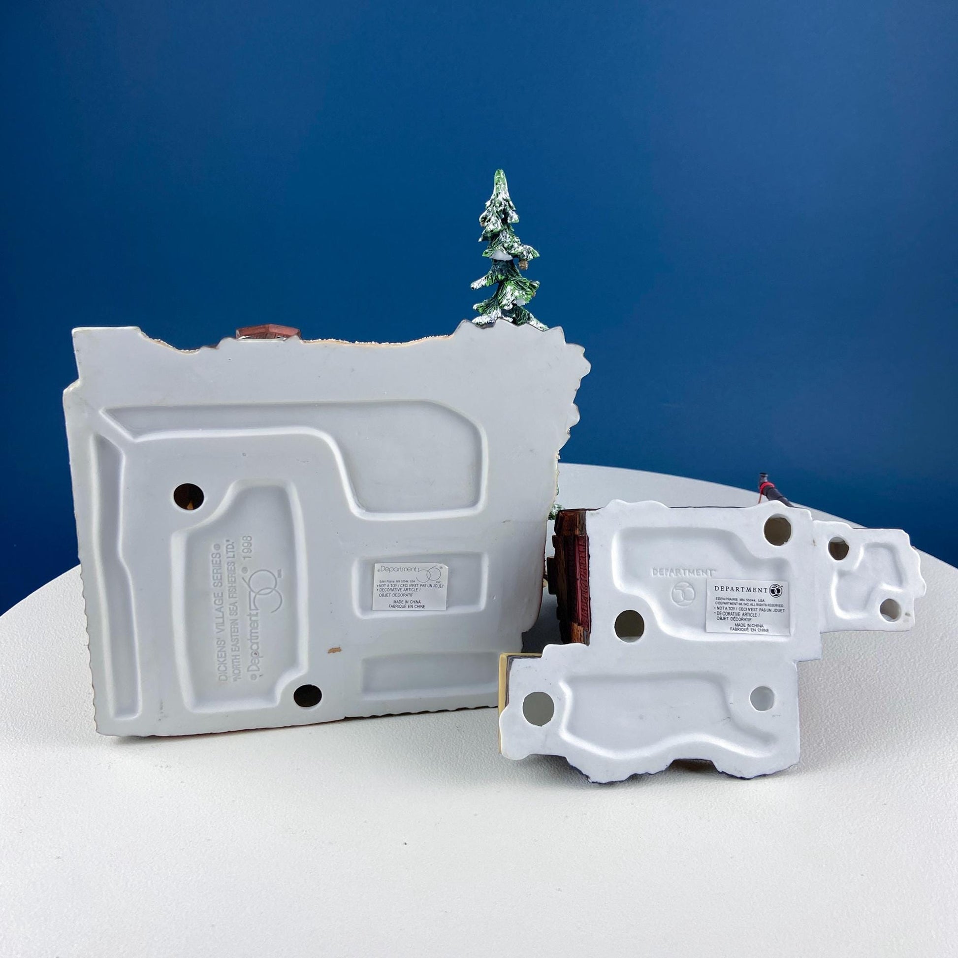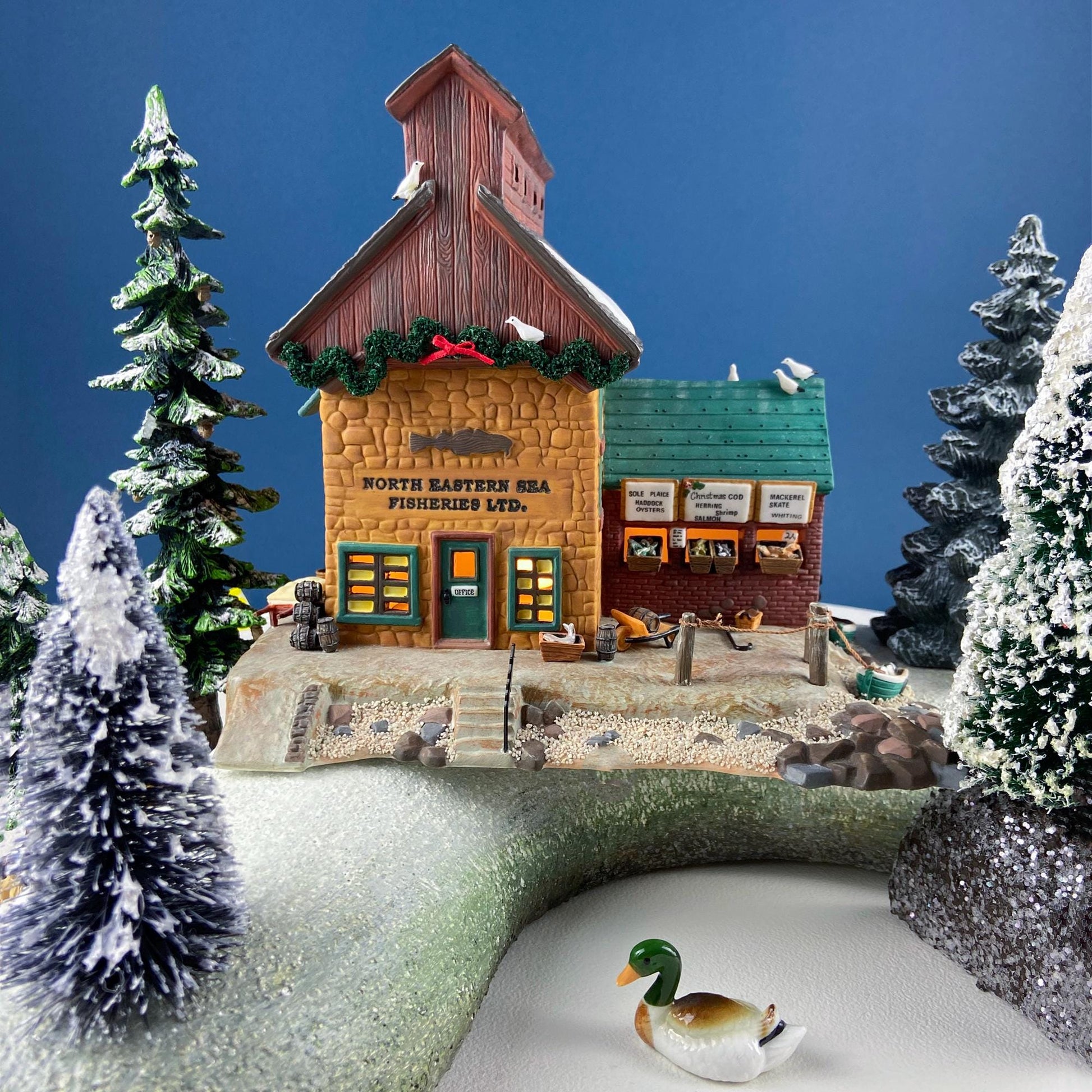 Christmas Village 2 Building Complex North Eastern Sea Fisheries. Illuminated Porcelain Houses. Incredible Hand Painted Detail by Dept. 56. Dickens' Village Series. Holiday Celebration Decor. Kids Room Display. Gift for Fisherman. Gift of Magic. Island Living. Light Kit Included. Additional Free-standing Islands, Trees, and Accessories are Sold Separately. *Please note that Smaller Bldg is not Illuminated.