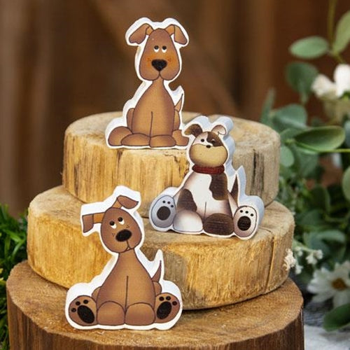 Chunky Puppy is an assortment of wooden sitters with three assorted designs. Sitters are dimensional with a flat base for freestanding display on risers, shelves, and tabletops. They are the perfect gift for dog lovers everywhere and measure 2.5" wide by 75" deep by 3" high. Please note: This item features an assortment of designs which are each sold individually (not as a set).