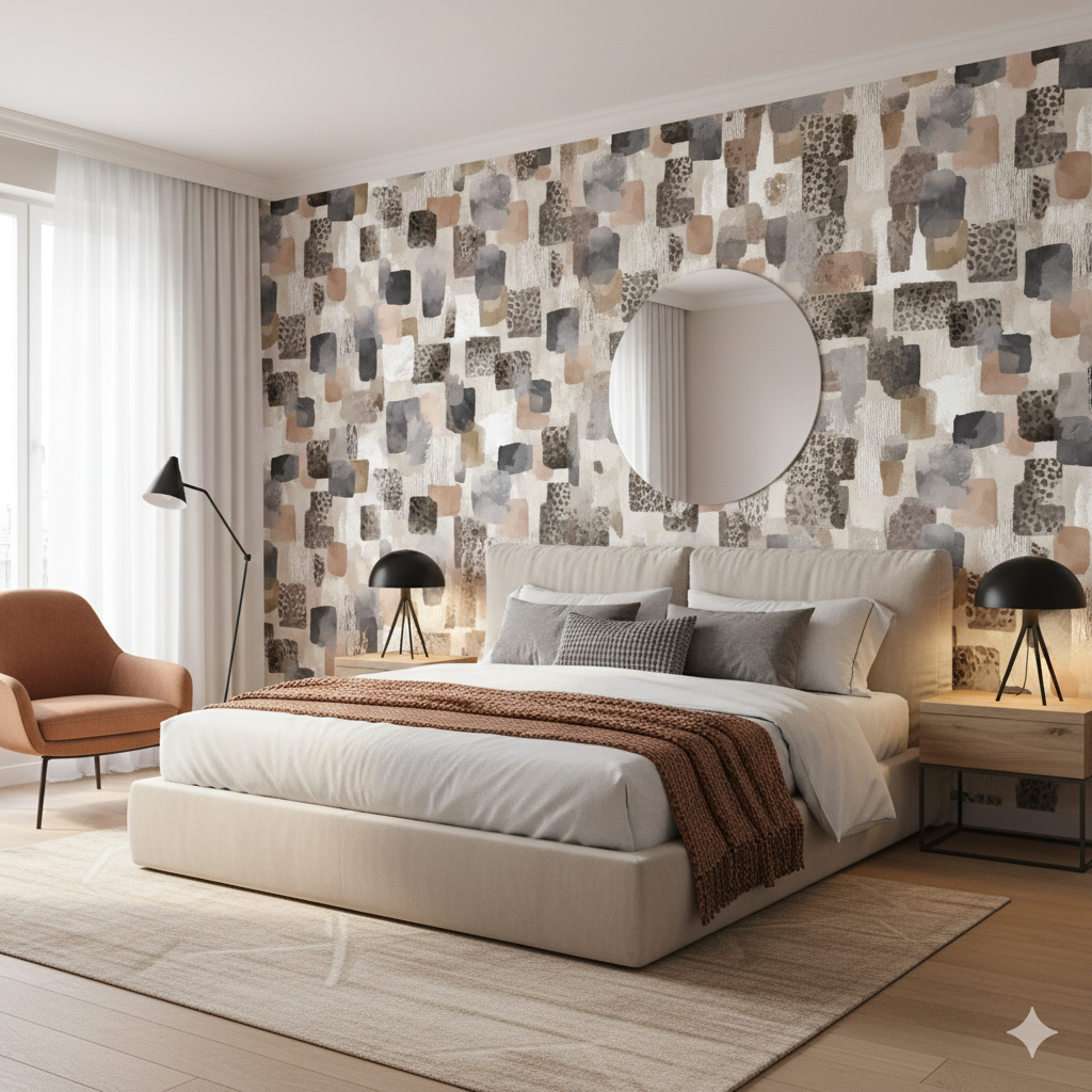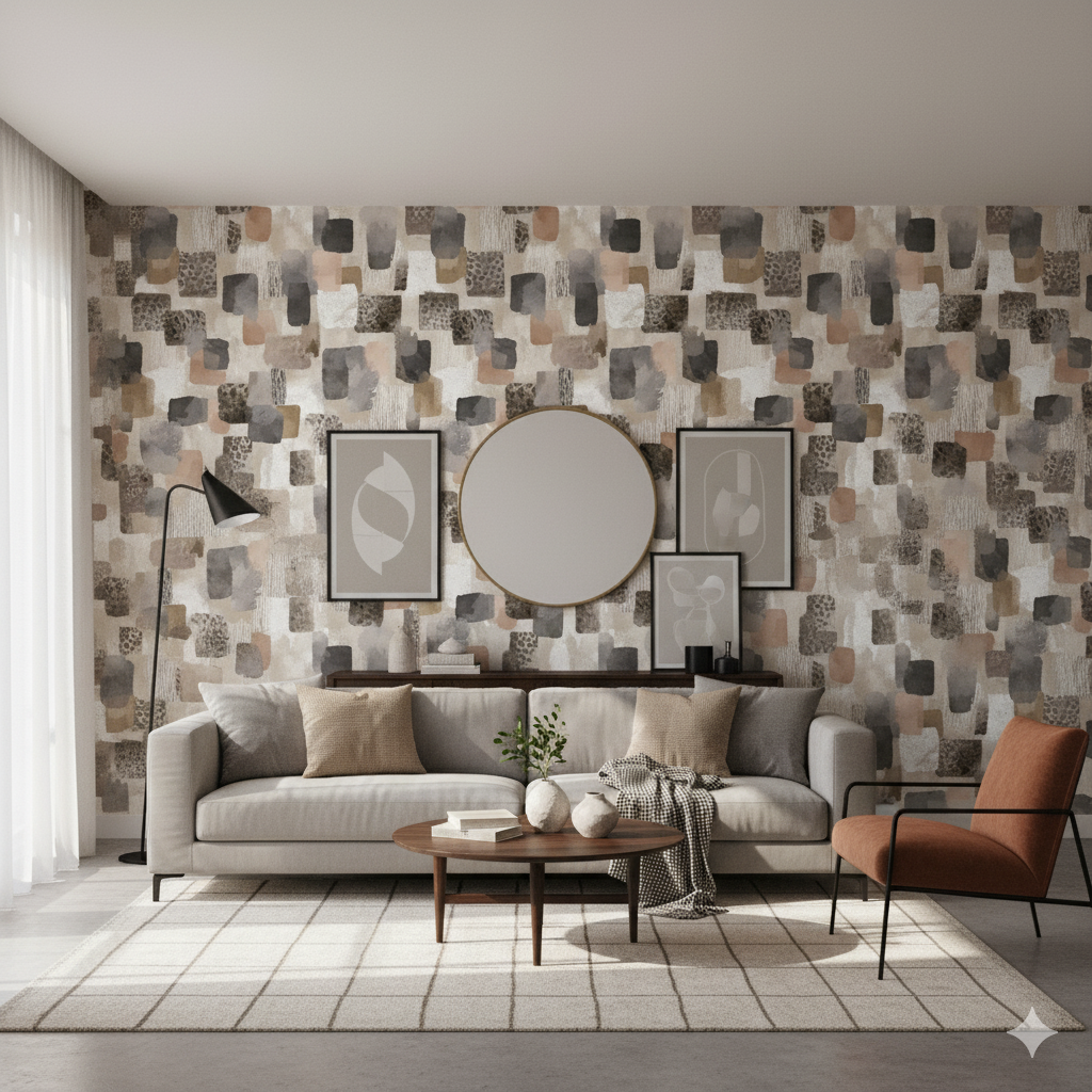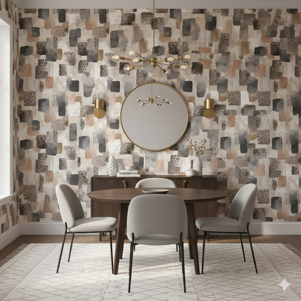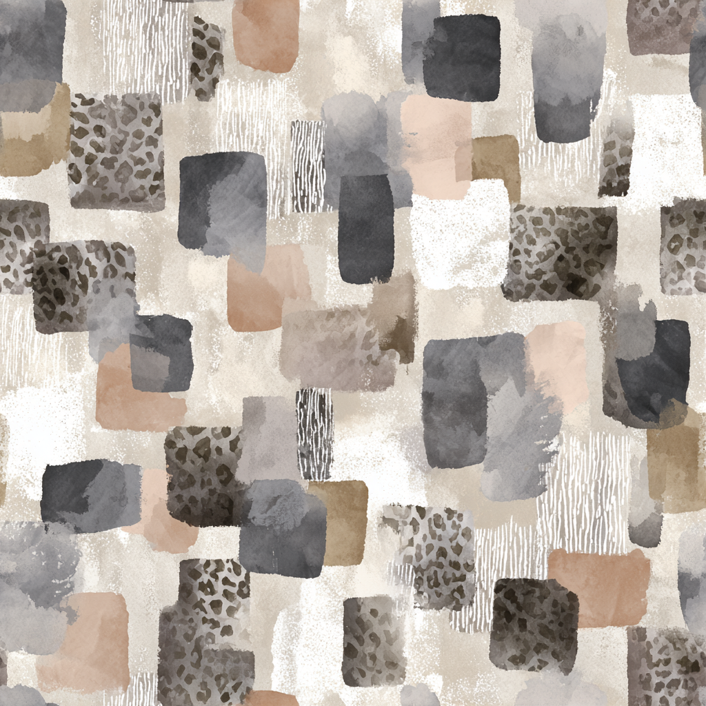 Cinder Mosaic is a patchwork of painterly rectangles in layered taupe, greige, charcoal, and muted browns, interspersed with subtle animal print and textured brush effects. It feels both urban and organic, with a palette that evokes weathered stone, aged wood, and layered textiles. Perfect for accent walls in modern lofts, eclectic bedrooms, or boutique-inspired powder rooms, this wallpaper delivers depth and dimension. The irregular markings ensure visual movement while staying within a muted color family, making it highly adaptable for those seeking understated drama.
