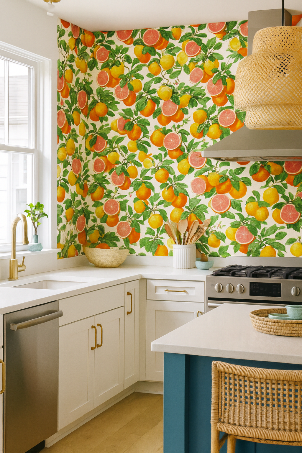 Bursting with zesty personality, Citrus Parade showcases oranges, grapefruits, and lemons—whole and sliced—on leafy branches against a crisp ivory backdrop. The saturated colors feel fresh off the tree, perfect for kitchens, dining nooks, or a juicy juice bar. It’s fruit-forward and fabulous.
