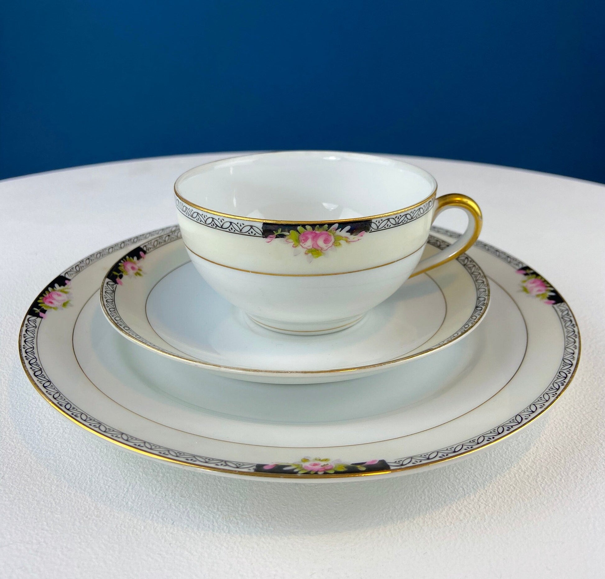 Classic Noritake Vintage Dinnerware. Beechmont Pattern. Rose Clusters and Black Backing. elegant, Minimal Dining and Serving Set. Wedding Registry. Excellent Condition. Marked by Manufacturer.