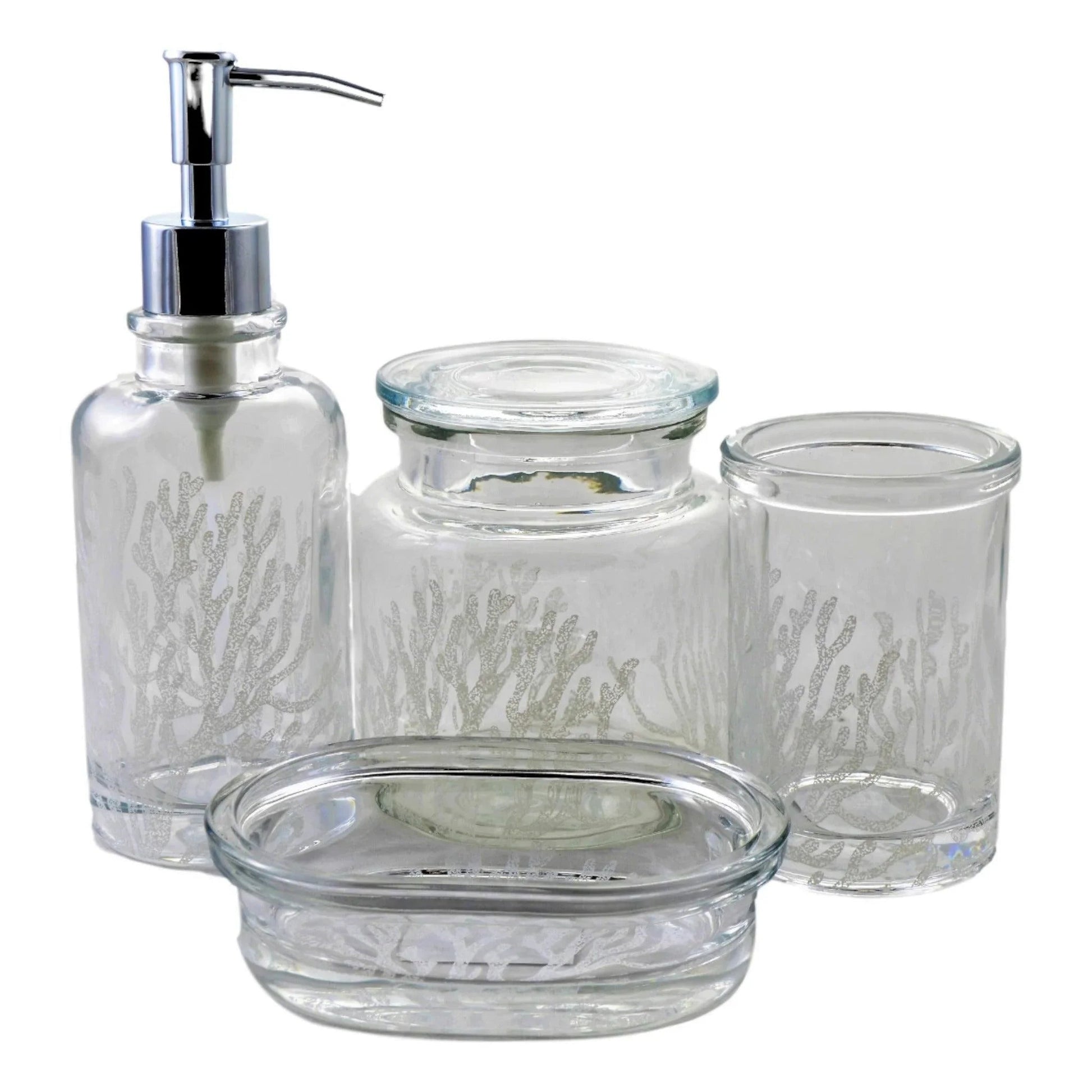 Experience a luxurious spa-like atmosphere in the comfort of your own bathroom with the Arctic Collection's Clear 4-Piece Bathroom Accessory Set. Crafted from Angus Glass with a laser-etched Arctic design, this set is both visually stunning and resilient. Complete with a strong, dependable dispenser pump, the set is the perfect addition to any home. The Arctic Collection's Clear 4-Piece Bathroom Accessory Set adds a touch of sophistication with its Angus Glass construction and laser-etched Arctic design. For a long-lasting solution, each piece in the set features durable construction and comes complete with a strong dispenser pump.