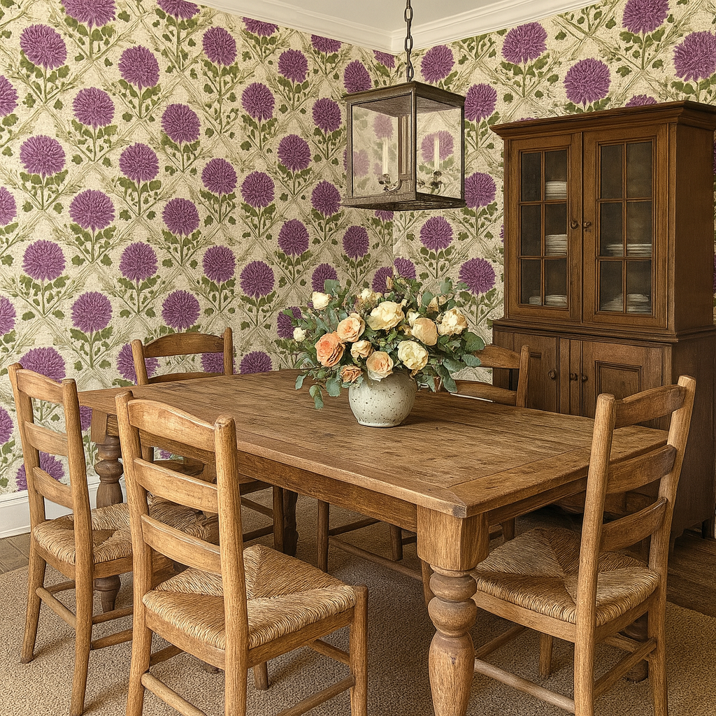 “Clover Carousel” spins a romantic nod to heritage charm with detailed depictions of purple prairie clovers arranged in a structured diamond grid. The plum-colored florals are accented with lush green stems and leafy textures, set against a cream backdrop with delicate latticework. Perfect for traditional dining rooms, cottage kitchens, or vintage-inspired guest rooms, this design delivers timeless elegance with a prairie twist.