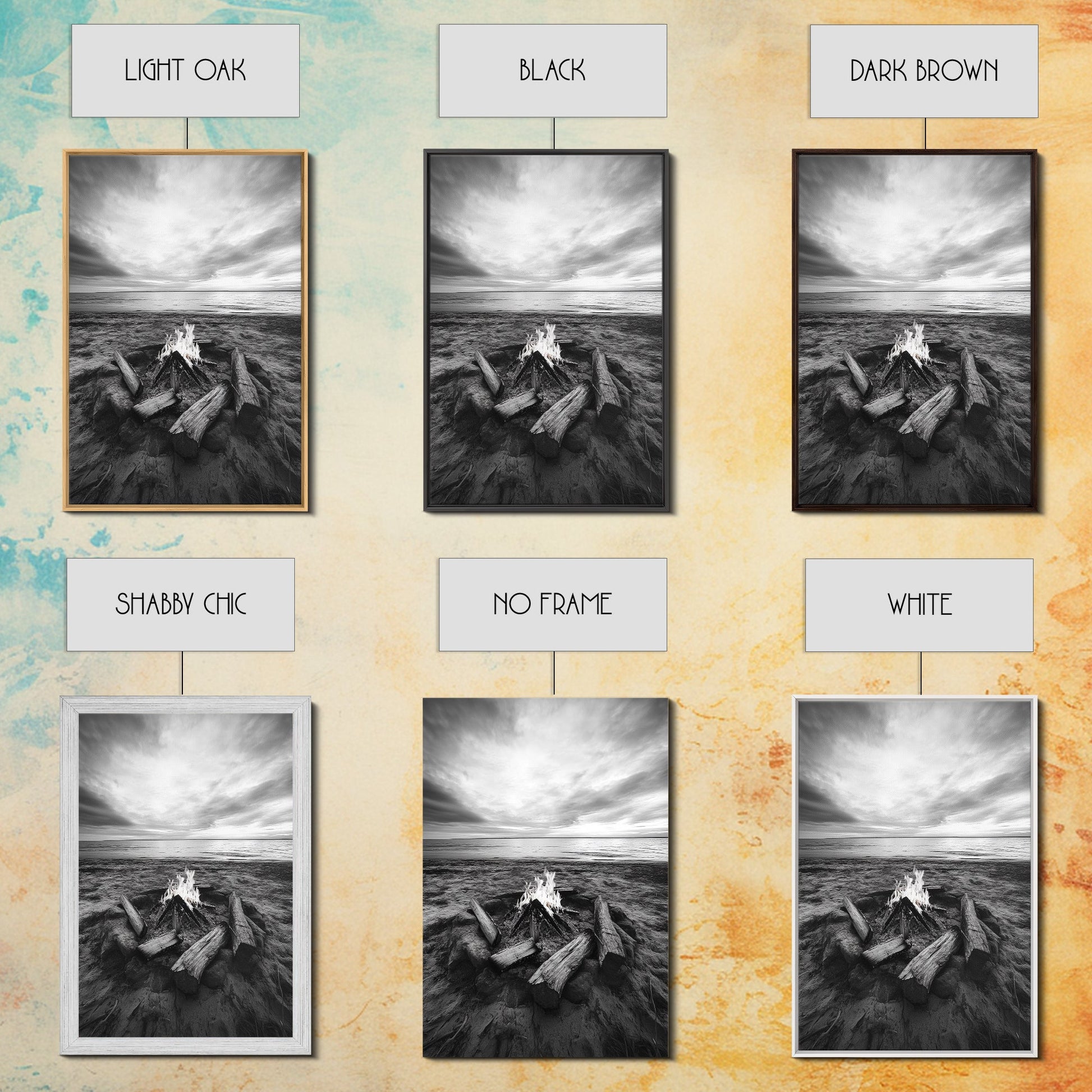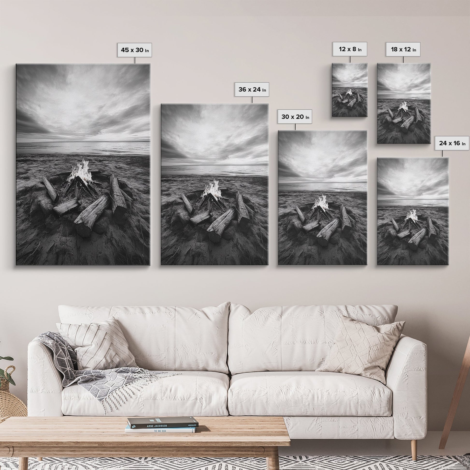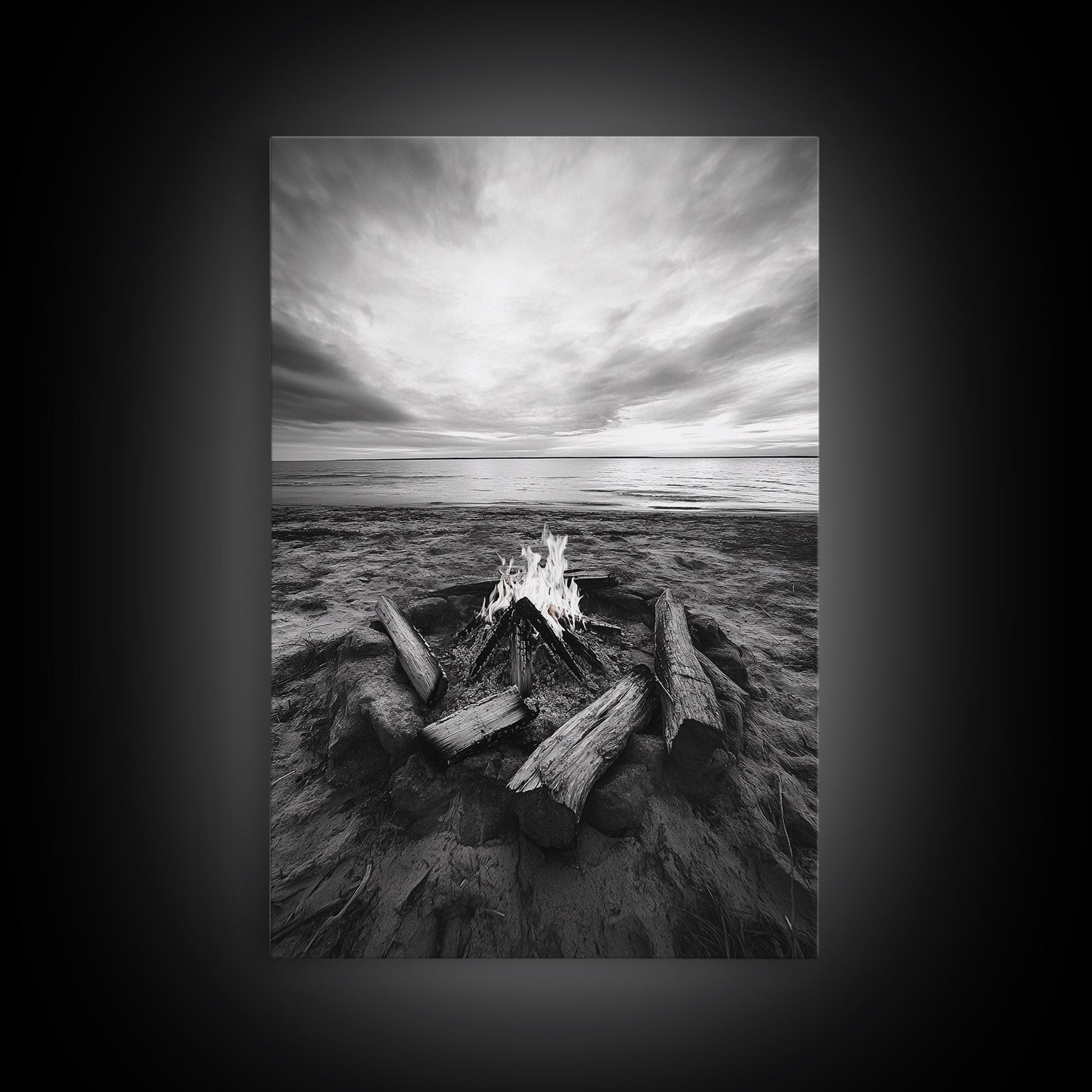 Coastal campfire glow, serene seaside bonfire, sunset flames, sandy warmth, Framed Canvas Print, Fall decor, cozy cabin wall art