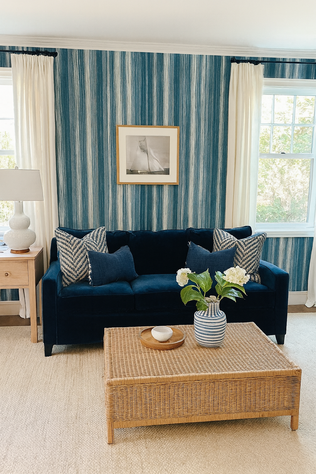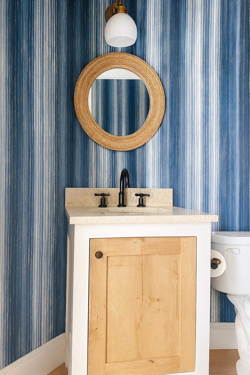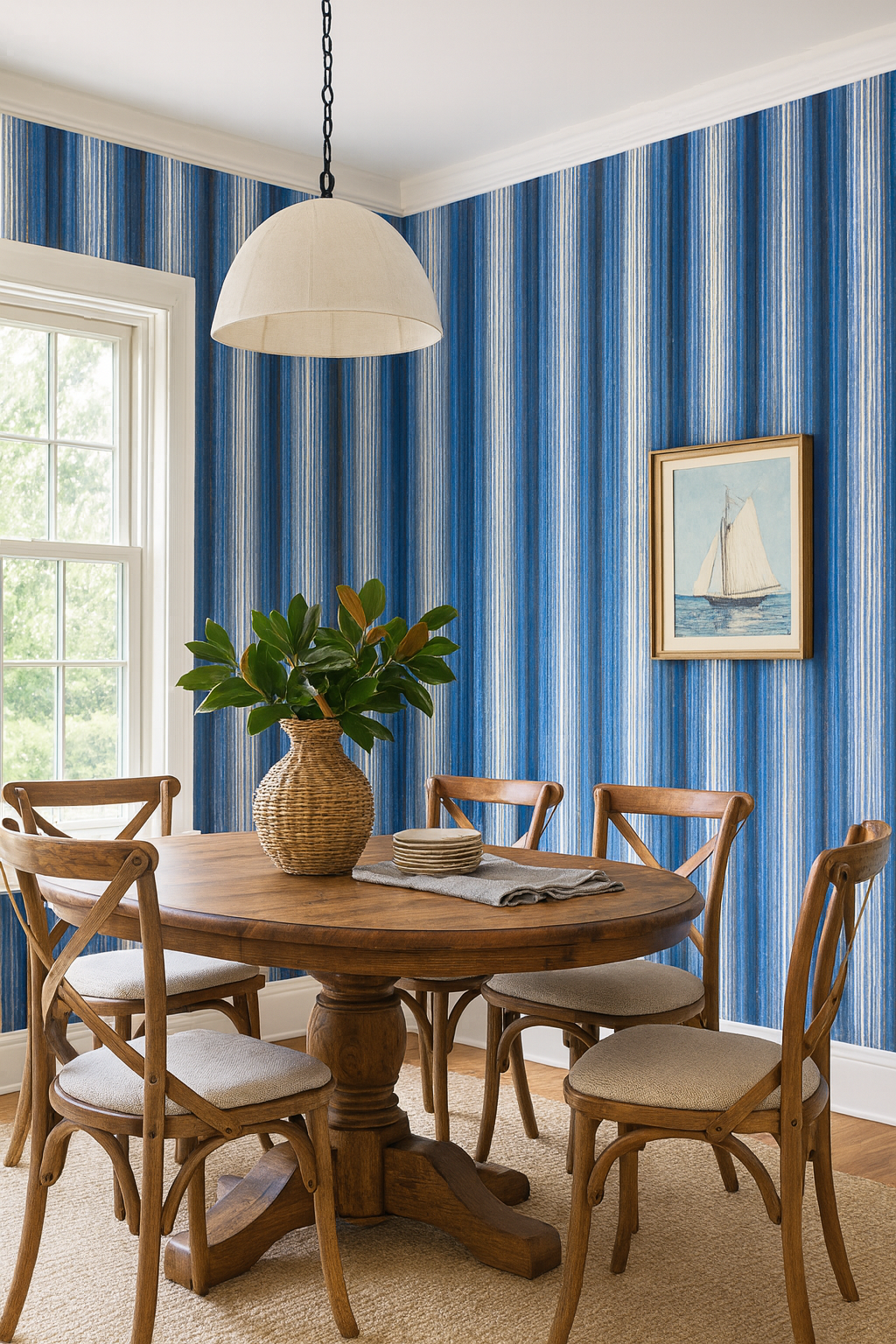 Vertical stripes in cascading tones of blue—from ocean mist to deep indigo—flow with the loose charm of hand-dyed ikat. “Coastal Strata” evokes relaxed coastal elegance and is perfect for beach homes, casual dining rooms, or even spa-inspired bathrooms needing a breezy, modern touch.