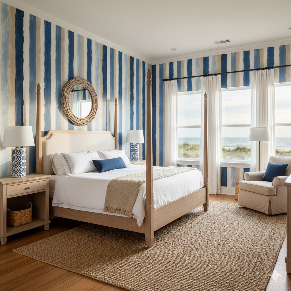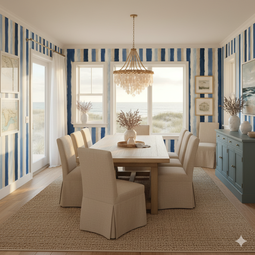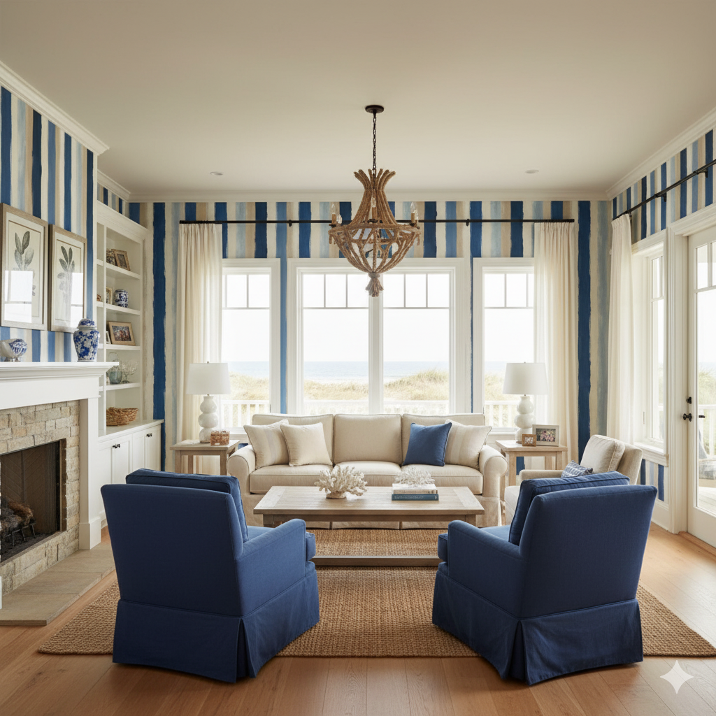 Bring breezy sophistication to your interiors with Coastal Strokes, a painterly vertical stripe wallpaper in hues of ocean blue, sandy beige, ivory, and misty sky. Broad brushstroke textures evoke a casual, hand-painted appeal, ideal for beach homes, bathrooms, or airy coastal-inspired dining rooms. This calming palette pairs effortlessly with rattan, driftwood, and whitewashed furniture for a relaxed seaside feel.