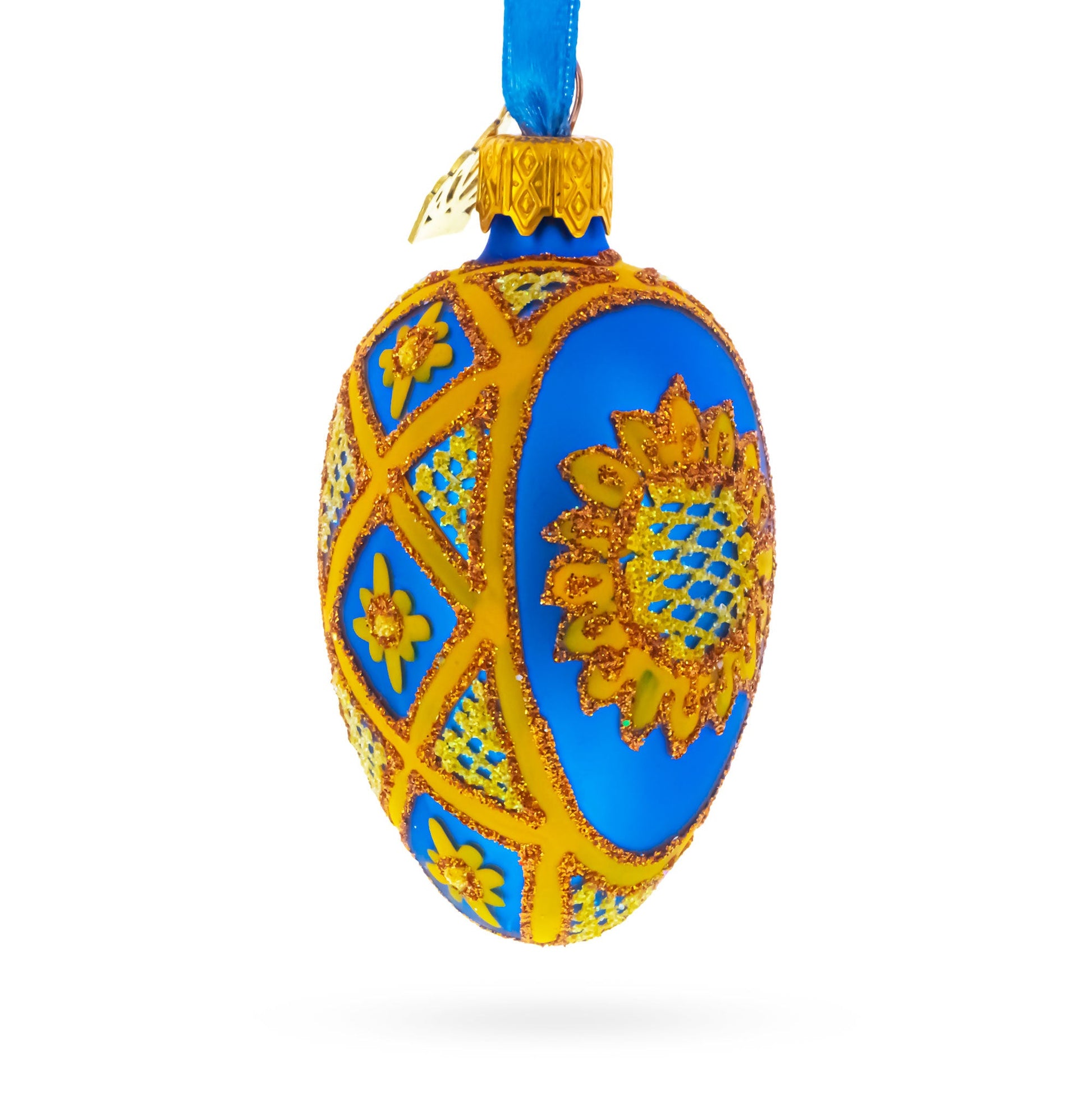 Cobalt Blue with Yellow Sunflower and Red Glitter Accents Mini Glass Egg Ornament 2.9 Inches
