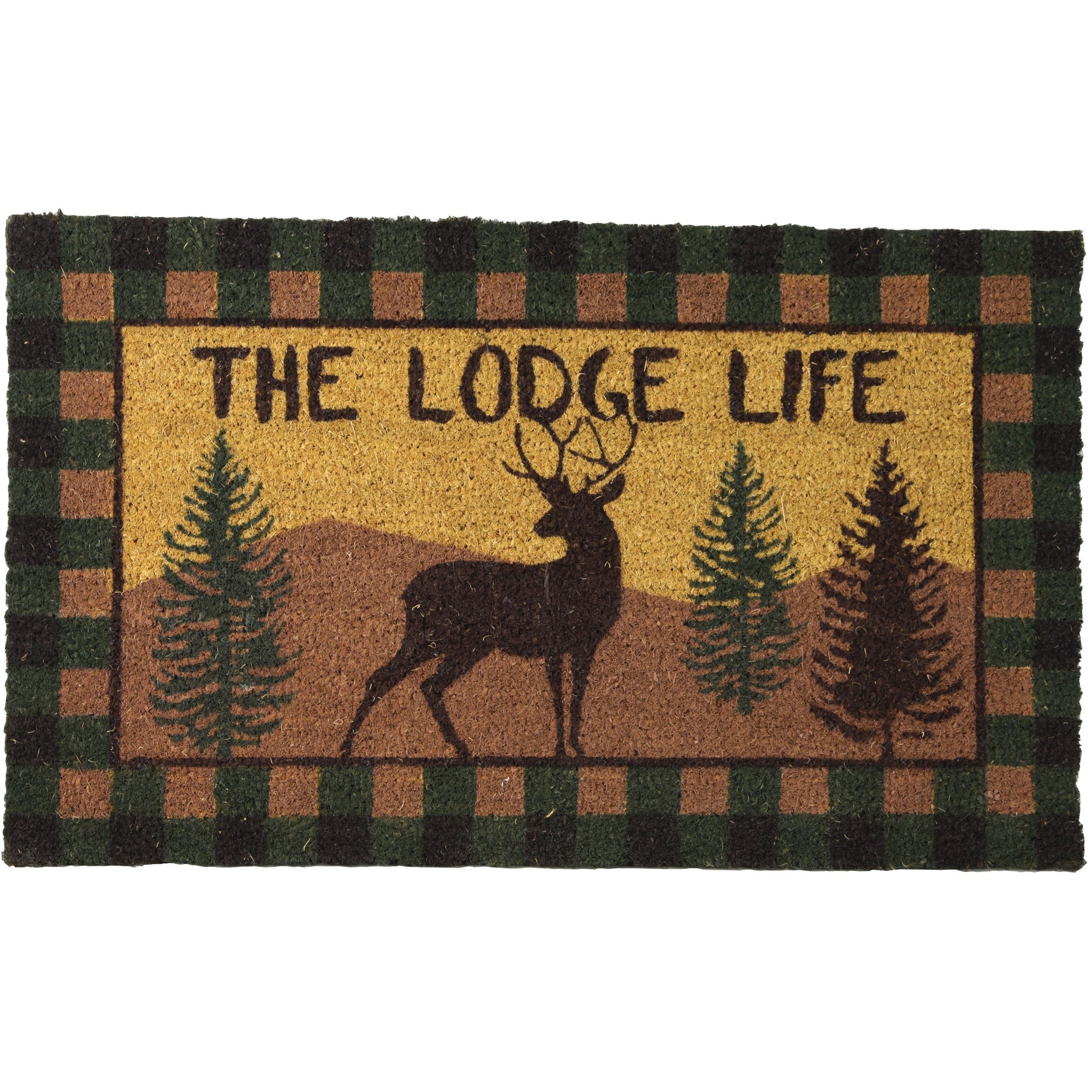 The lodge life coir mat by River's Edge Products will make your porch more welcoming and accentuate your appreciation of the outdoors. The mat features the silhouette of a deer between pine trees with a mountain backdrop. The message "The Lodge Life" is displayed along the top border.