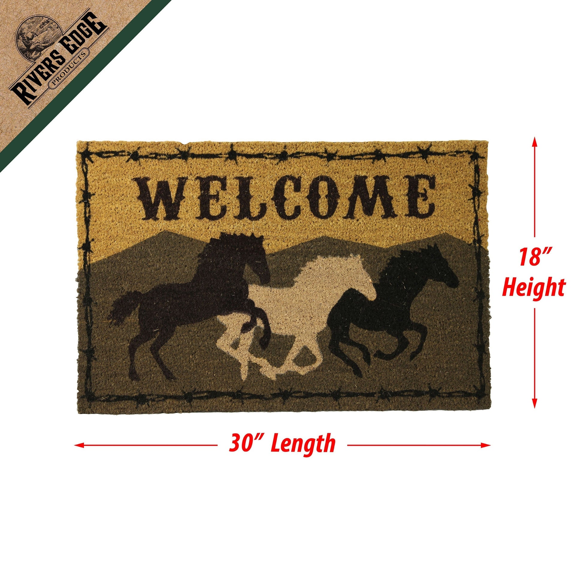 The horse coir welcome mat by River's Edge Products will accentuate your appreciation of horses and life on a ranch. The mat features the word "Welcome" displayed along the top border with 3 horses in brown, white, and black galloping across the center framed by barbed wire with a mountainous backdrop.