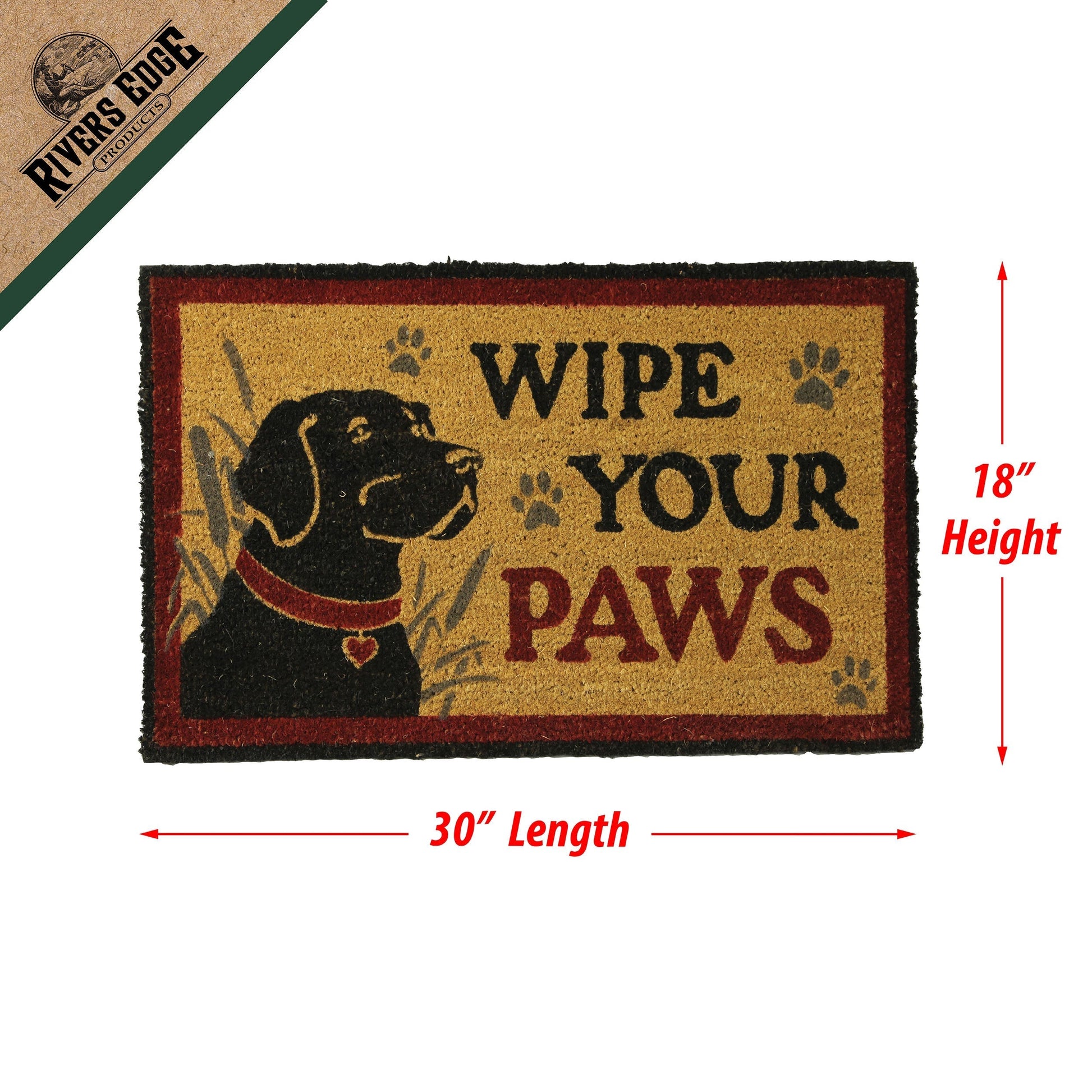 The wipe paws lab coir mat by Rivers Edge Products will make your porch more welcoming with its lovable dog image. The mat features a black Labrador Retriever with a red collar with the message "Wipe Your Paws" on the right accented by cattails and paw prints. The border is an eye-catching red and black.