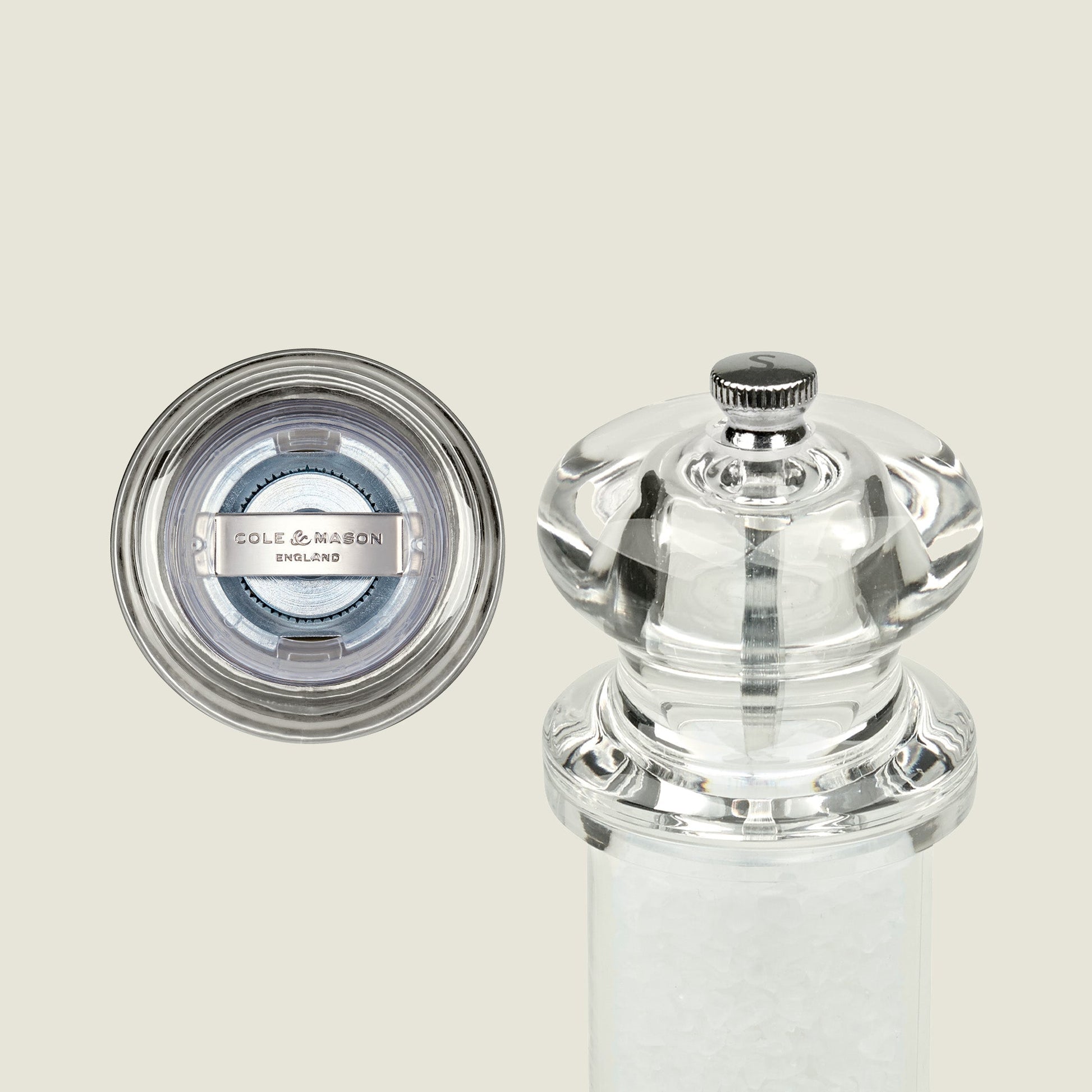 The 505 Salt & Pepper Mills feature a timeless clear acrylic design that showcases the contents while seamlessly blending with any kitchen or dining décor. The mills stand at an ideal height for comfortable use and are equipped with high-quality grinding mechanisms—carbon steel for pepper and sharp ceramic for salt. These durable mills allow for smooth and effortless seasoning with adjustable settings, making them a versatile addition to both home kitchens and professional settings.