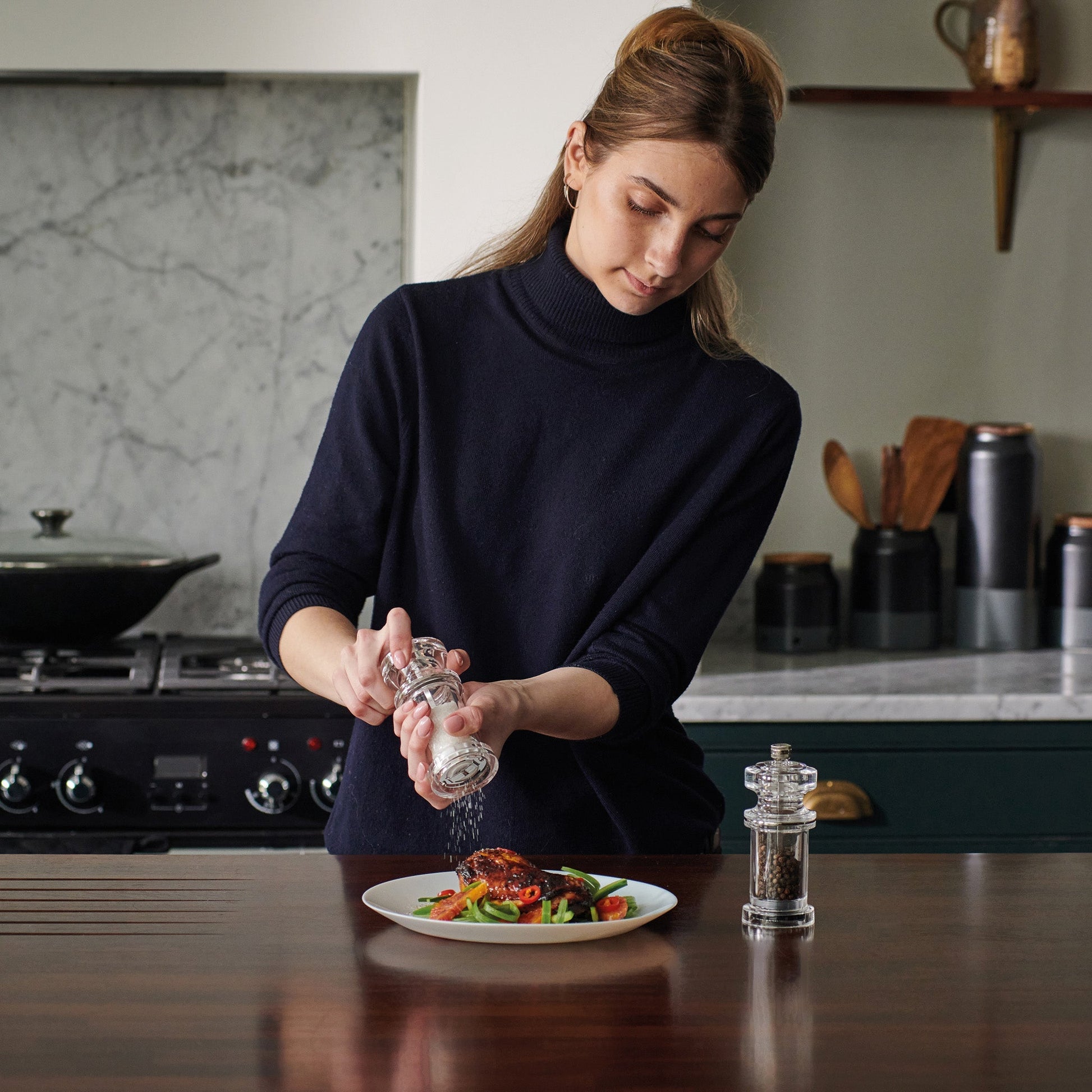 The 605 Salt & Pepper Mills are a modern take on classic acrylic mills, offering a durable and easy-to-clean transparent body that allows for easy monitoring of salt and pepper levels. These mills feature a high-performance grinding system with six adjustable settings for pepper and three for salt, giving you complete control over your seasoning preferences. The carbon steel mechanism for pepper ensures a precise grind, while the sharp ceramic salt mechanism prevents corrosion. A stylish and functional addition to any kitchen, these mills provide long-lasting performance and effortless grinding.