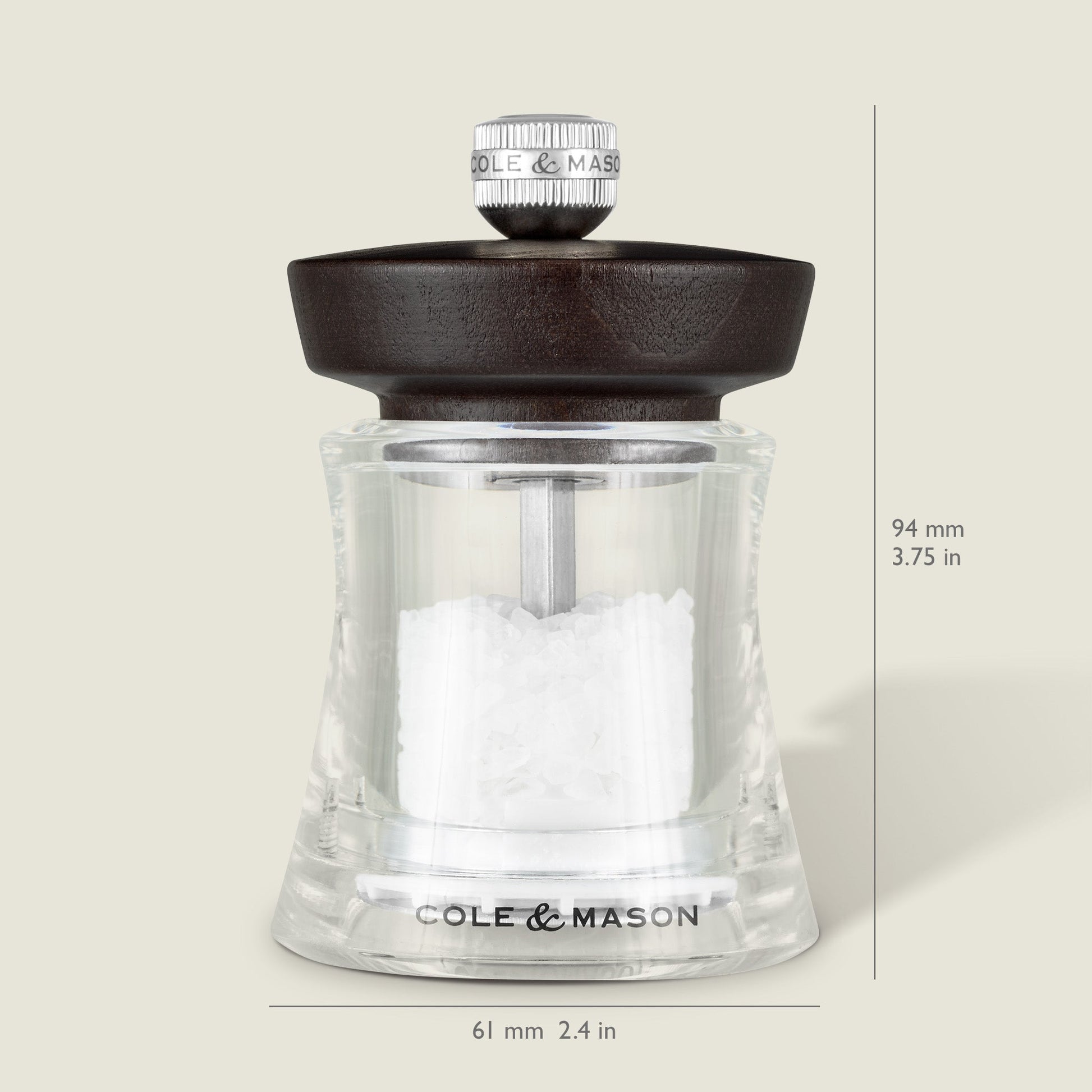 Made from durable acrylic and high-grade beech wood and standing only 90mm/3.5 inches tall, with its squared edges and stainless-steel collar, the Holborn mill has a contemporary and bold yet timeless aesthetic. Its innovative design and premium quality are synonymous with the Cole & Mason brand. The versatility of the acrylic finish makes this mill perfect for both traditional and modern kitchens. Easily adjust the grind from fine to coarse by turning the knob on the top of the mill. Made from durable acrylic and high-grade beech wood. Arrives partially filled. Mills come unboxed with a swing tag. Clean with a microfiber cloth to keep the mills looking their best.
