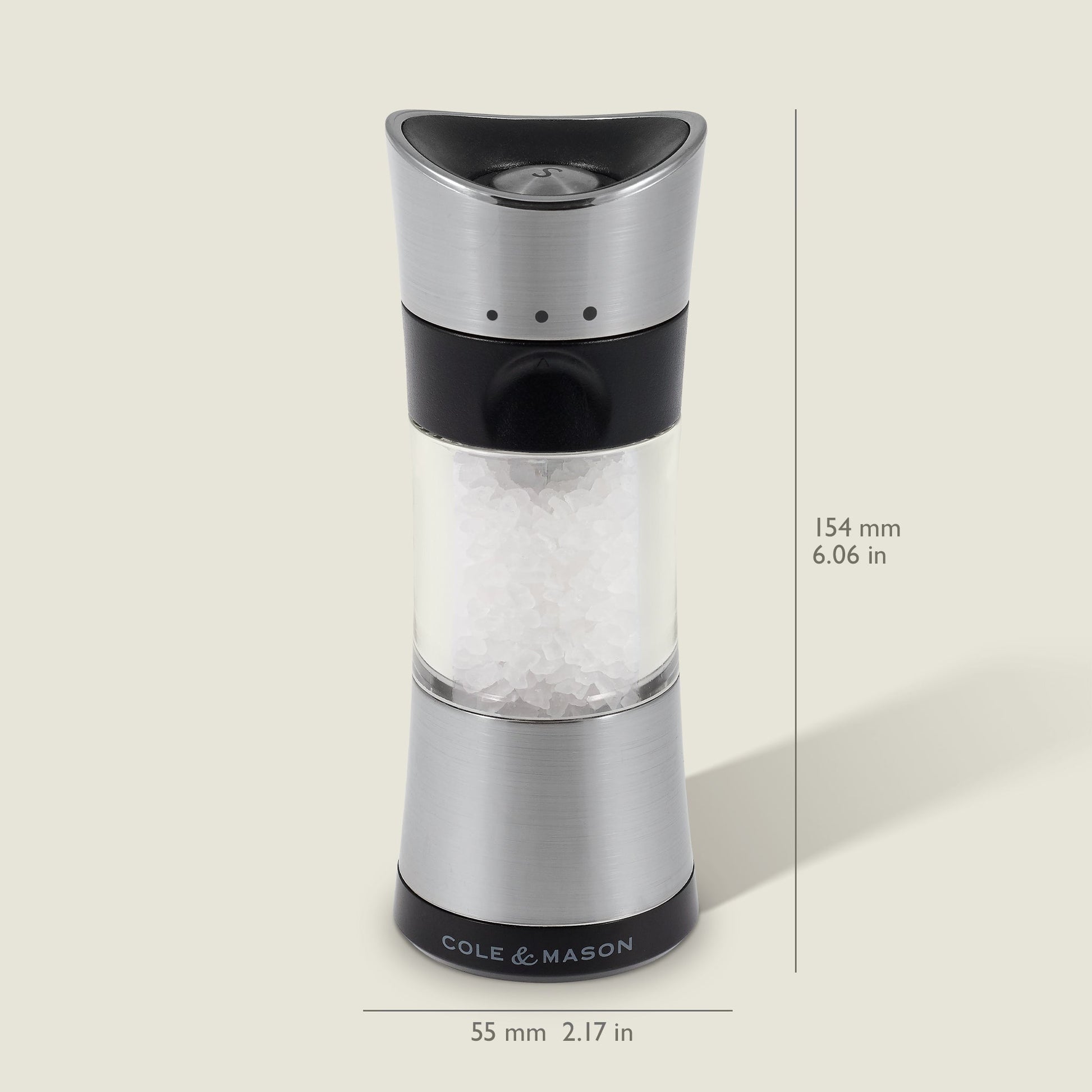 - Conveniently select between 5 preset grind levels for Pepper and 3 preset grind levels for salt