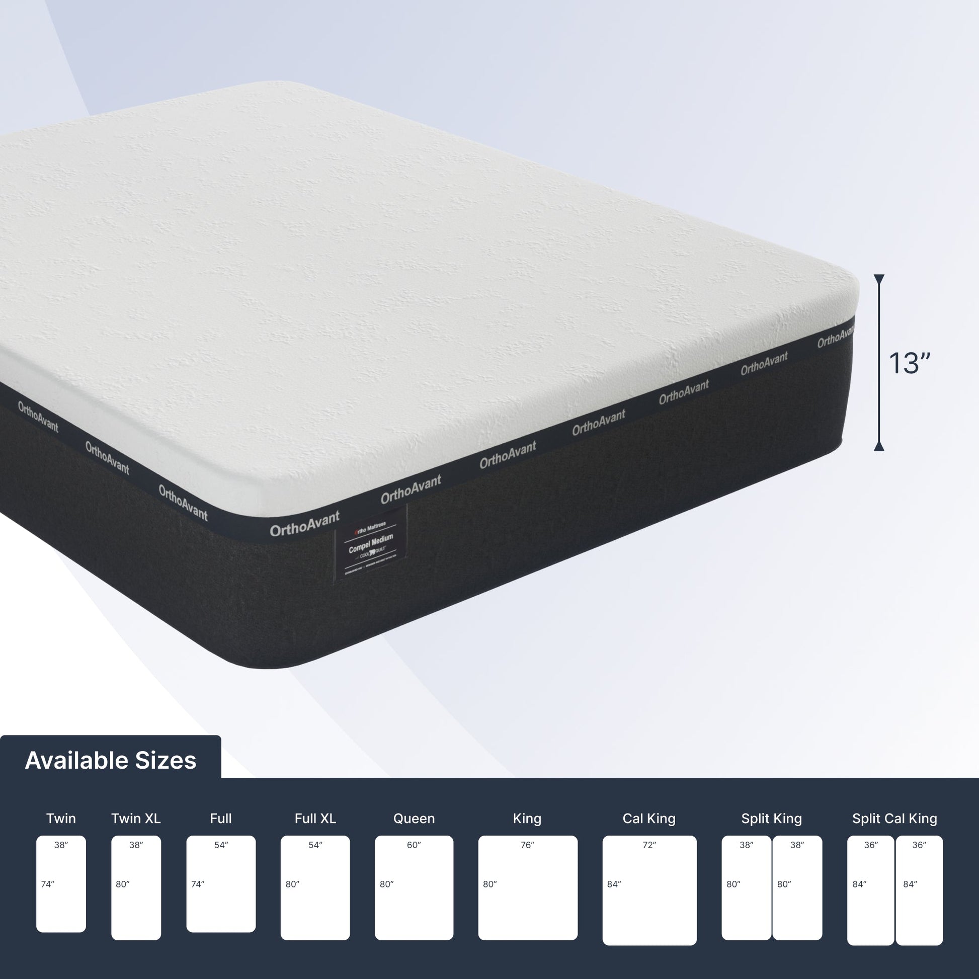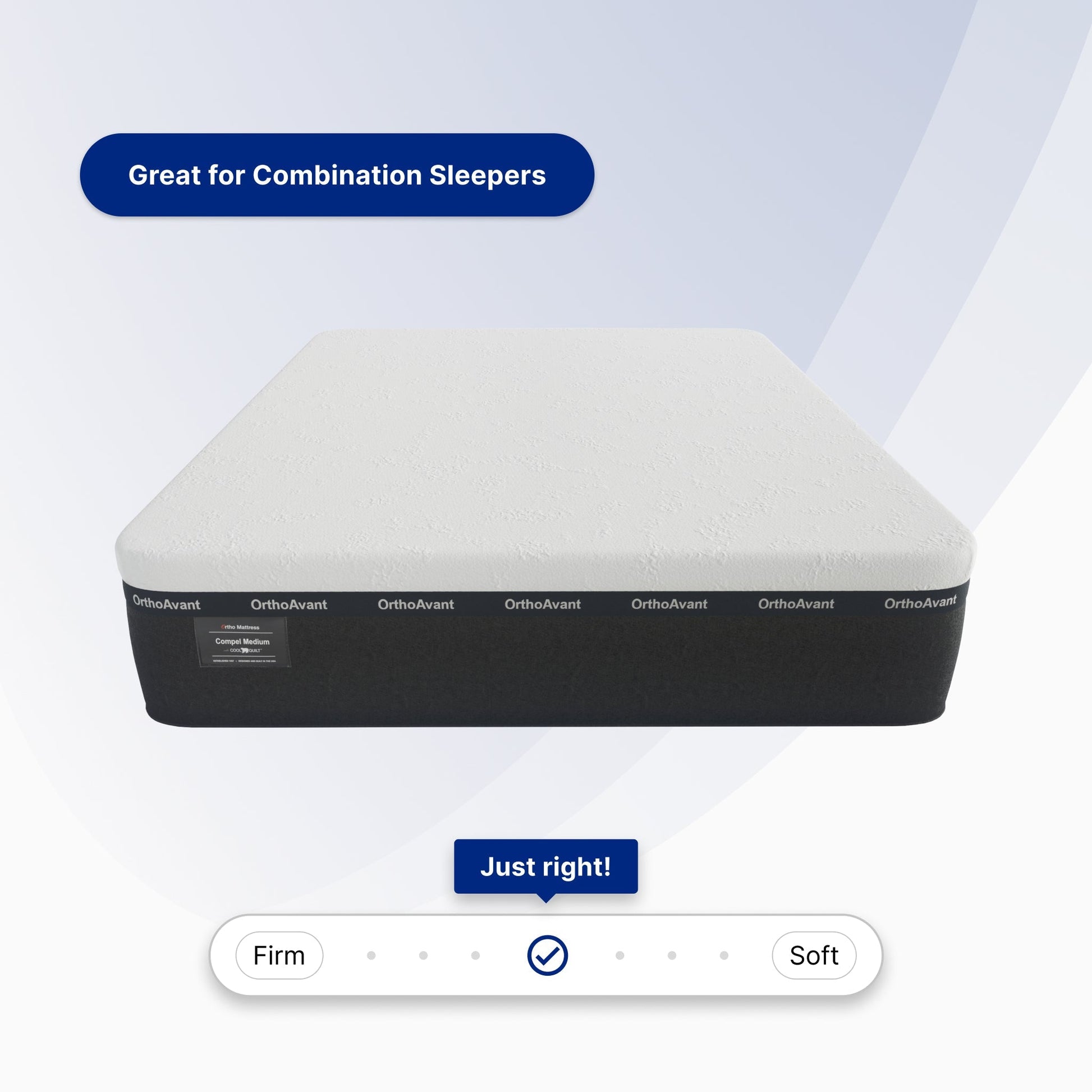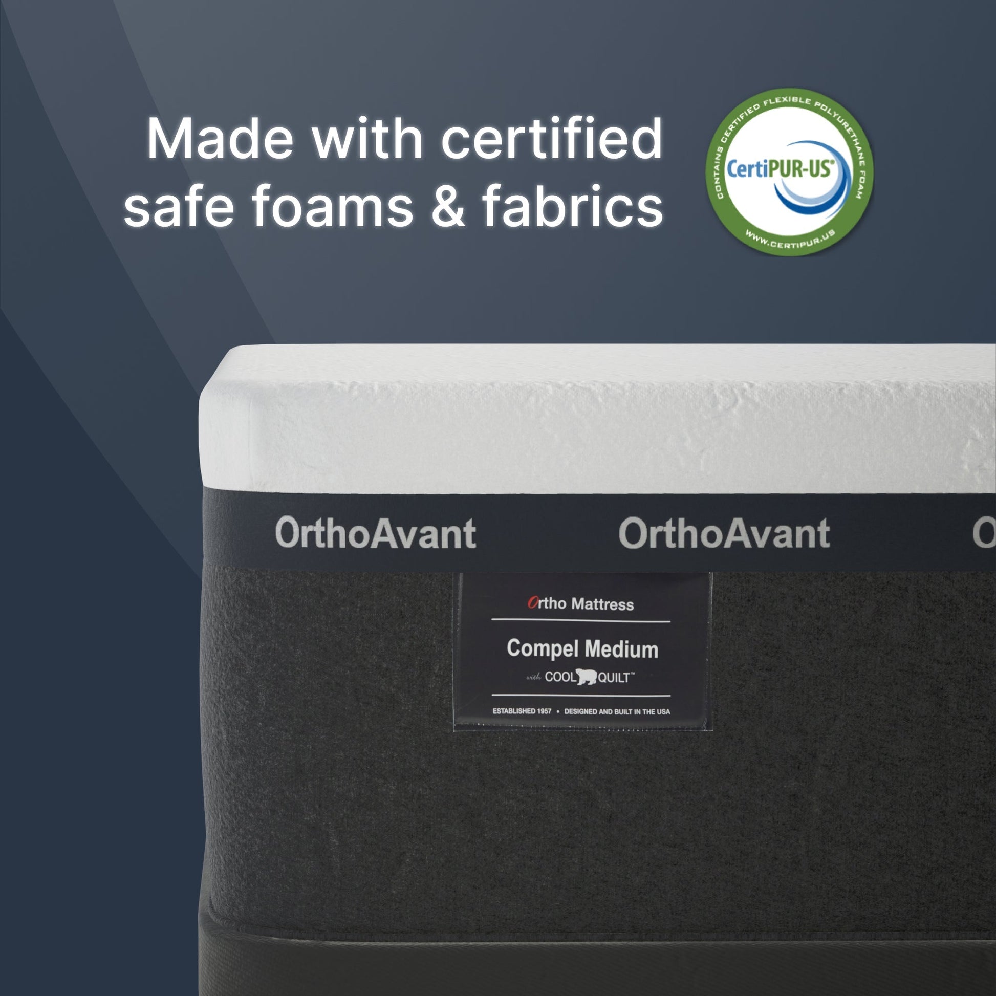 The Compel Medium provides a good balance between firm support with a conforming feel, allowing you to experience both support and pressure relief simultaneously. Features include Ortho's Avant® Modern Memory Foam and our CoolQuilt®, which keeps the mattress 4° cooler.