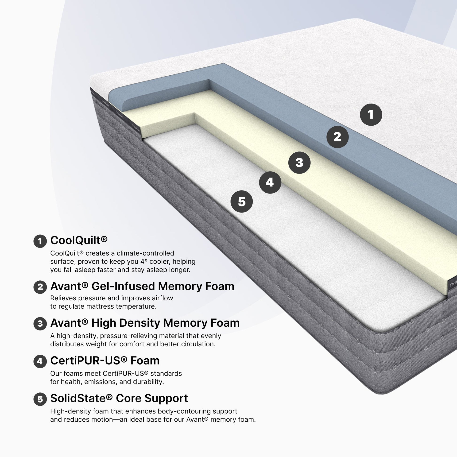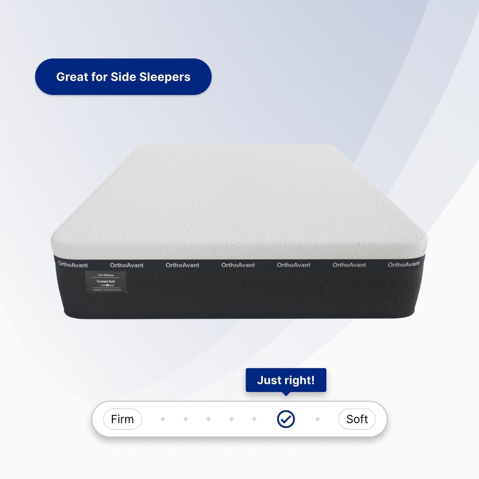 The Compel Soft is the ultimate soft and cooling mattress. This cloud like feel allows you to experience both support and pressure relief simultaneously. Features include Ortho's Avant® Modern Memory Foam and our CoolQuilt®, which keeps the mattress 4° cooler.