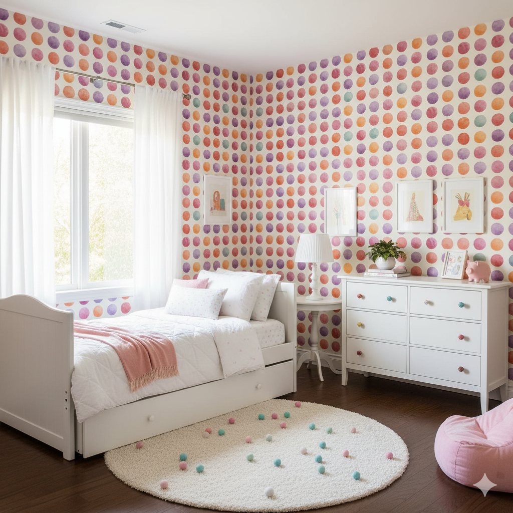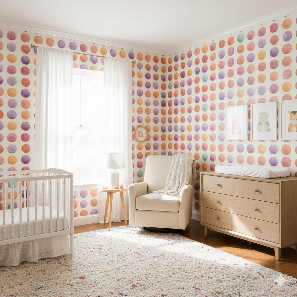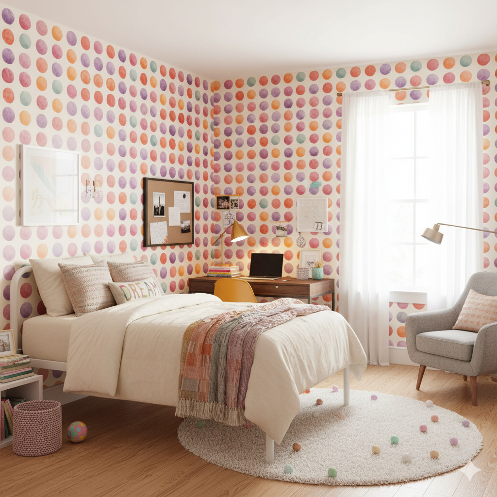 Rows of perfectly imperfect watercolor dots in vibrant shades of coral, goldenrod, lilac, turquoise, and poppy red create a lively, celebratory energy. Each dot carries a hand-painted texture that feels organic and spontaneous. Great for kids’ rooms, craft studios, or accent walls where a joyful punch of color is needed. The repeating grid keeps the design orderly while the varied hues keep it fresh and energetic, almost like scattered candy or playful festival lanterns.
