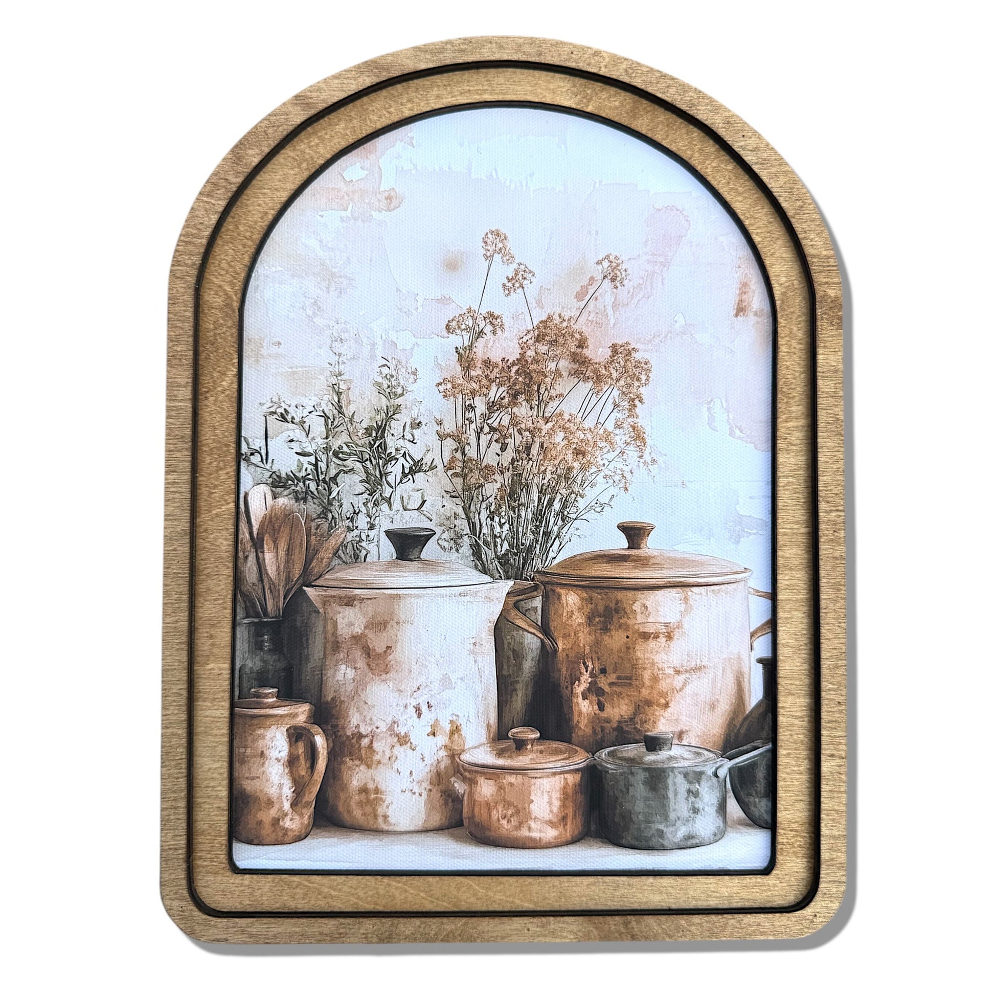 This arch-top framed artwork brings a rustic kitchen charm to your space with its warm copper pot illustration and soft neutral background. Printed with premium Canon pigment inks on canvas, the piece is mounted on a sturdy wood backer and framed with a double-layered wood frame in an Early American stain. Its compact size makes it perfect for a kitchen shelf display or a cozy wall vignette.