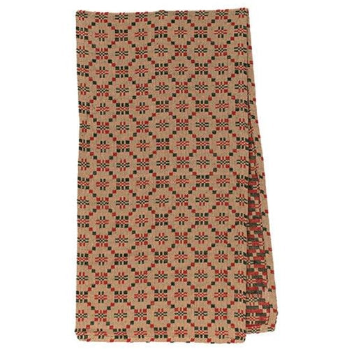 Country Snowfall Long Runner is a 100% cotton runner. Runner is tan with a red and green pattern and it is machine-washable for easy upkeep. It is a simple way to dress up a dining table and it measures 14" high by 56" wide.