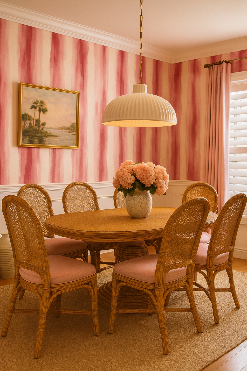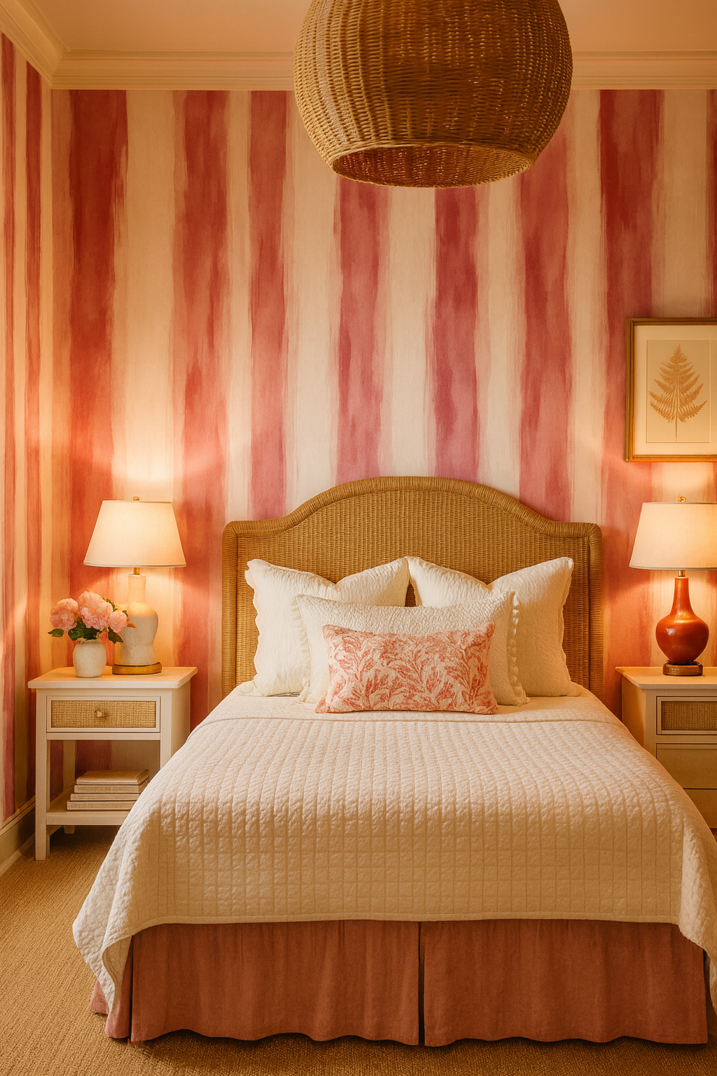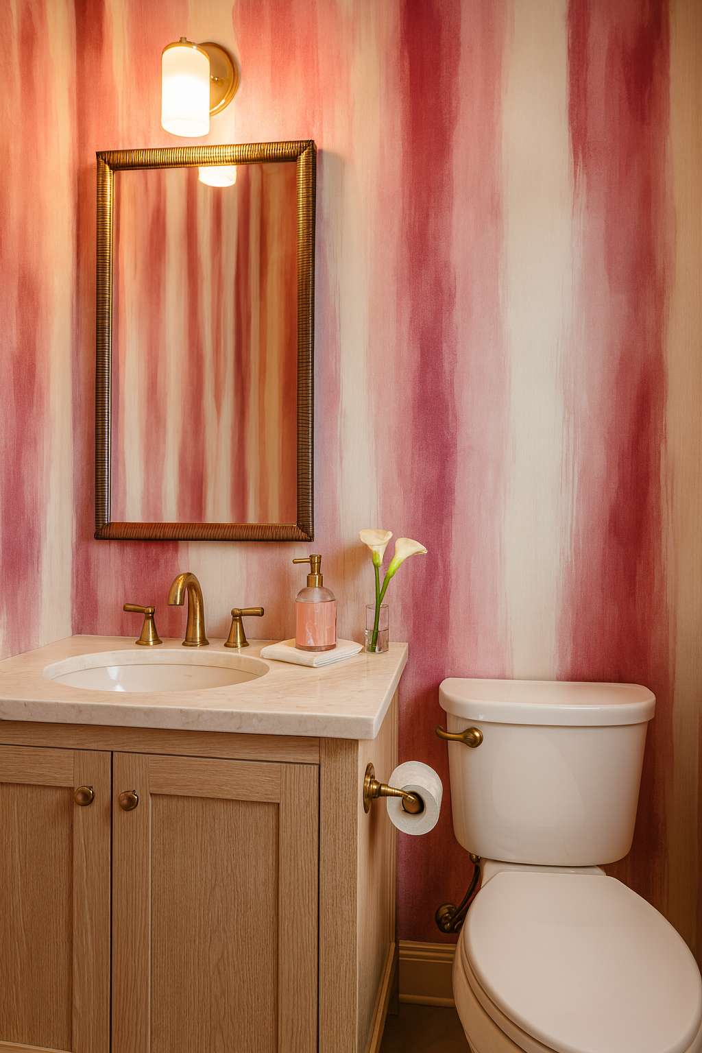 Vertical bands of crimson and blush appear as if painted in watercolor washes, with edges that blur into creamy neutrals, creating a sense of movement and softness. The tonal variation brings dimension, like textiles dyed by hand, offering both warmth and drama. Crimson Veil is ideal for rooms where intimacy and richness are desired — a moody dining room, a romantic bedroom, or a chic hospitality space like a wine bar or boutique hotel. Its artisanal look pairs especially well with velvets, matte finishes, and warm metals, enhancing its tactile appeal.