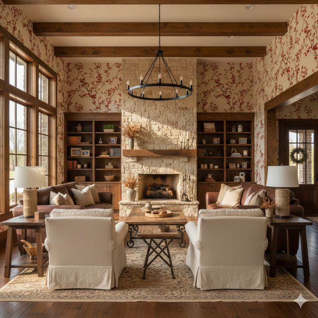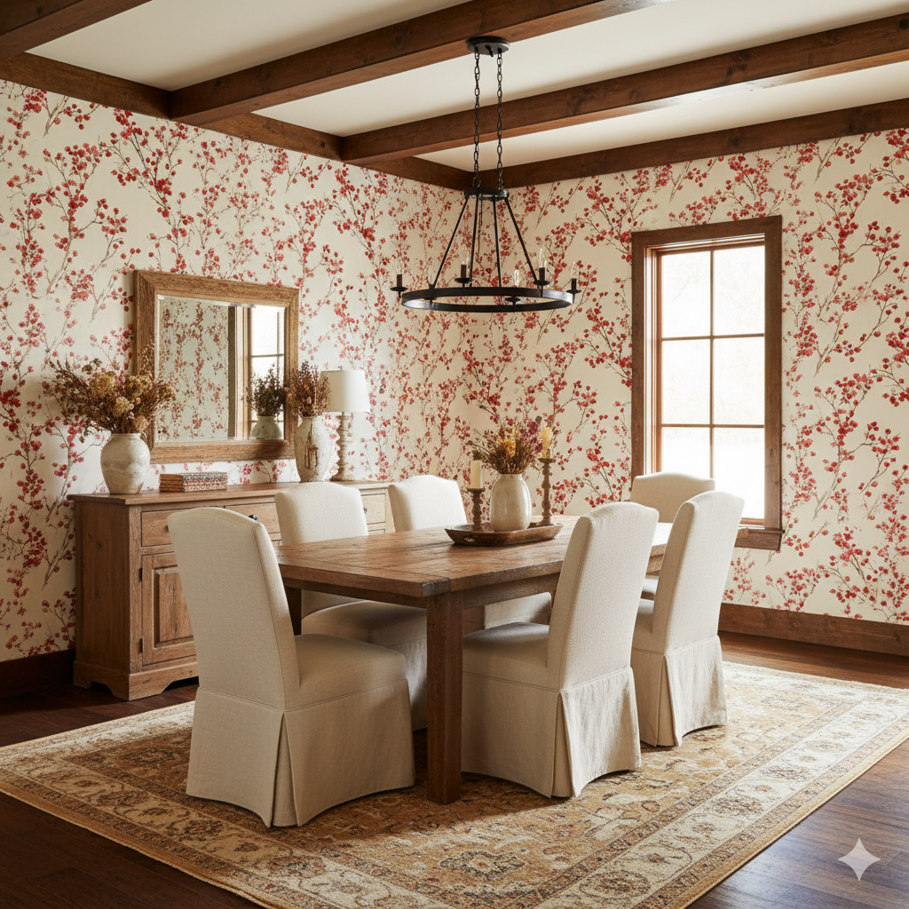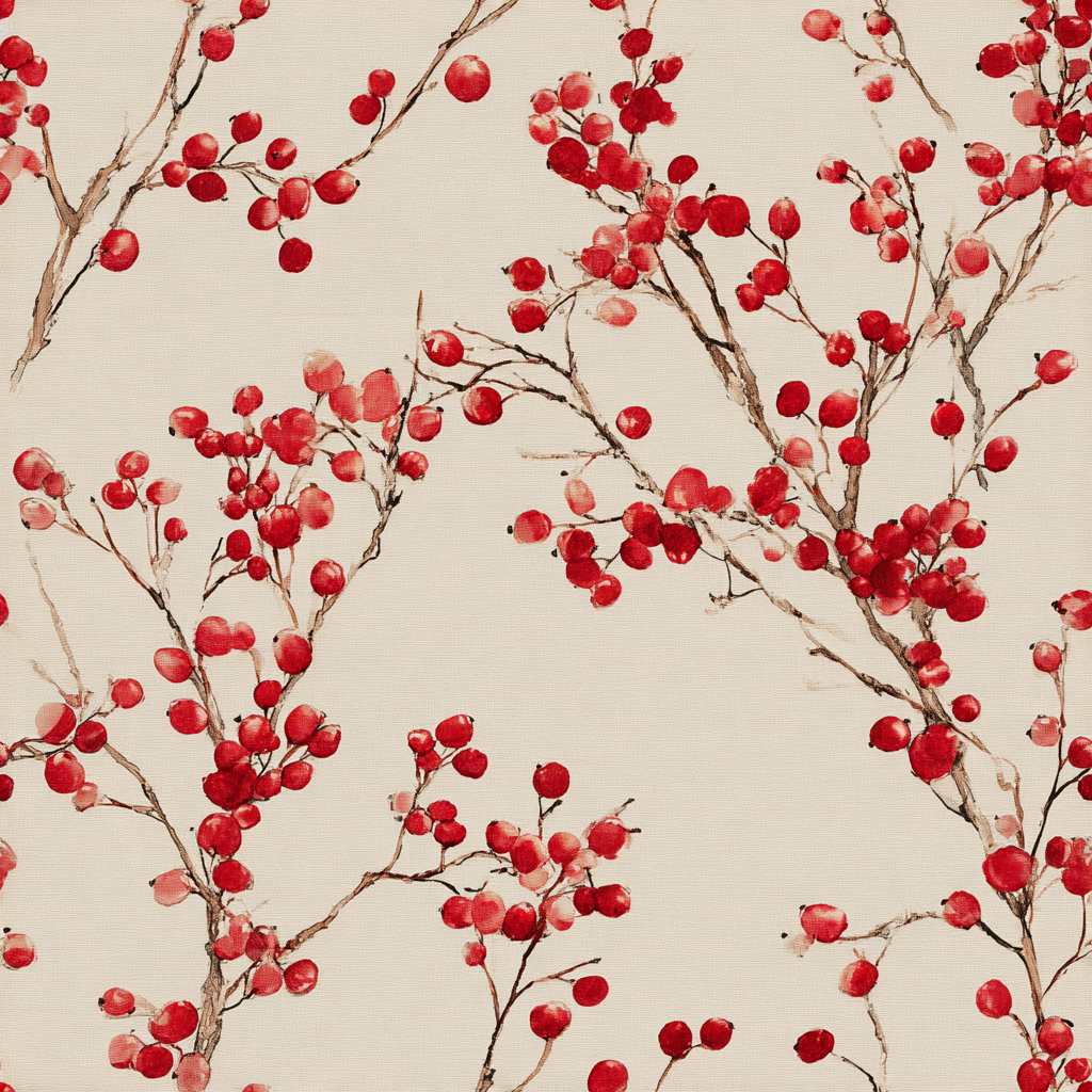 Bright red winterberries cluster like drops of paint against bare twigs on a warm ivory ground. Festive yet timeless, this wallpaper brings seasonal cheer year-round — perfect for entryways, cozy dining rooms, or spaces that embrace rustic charm.