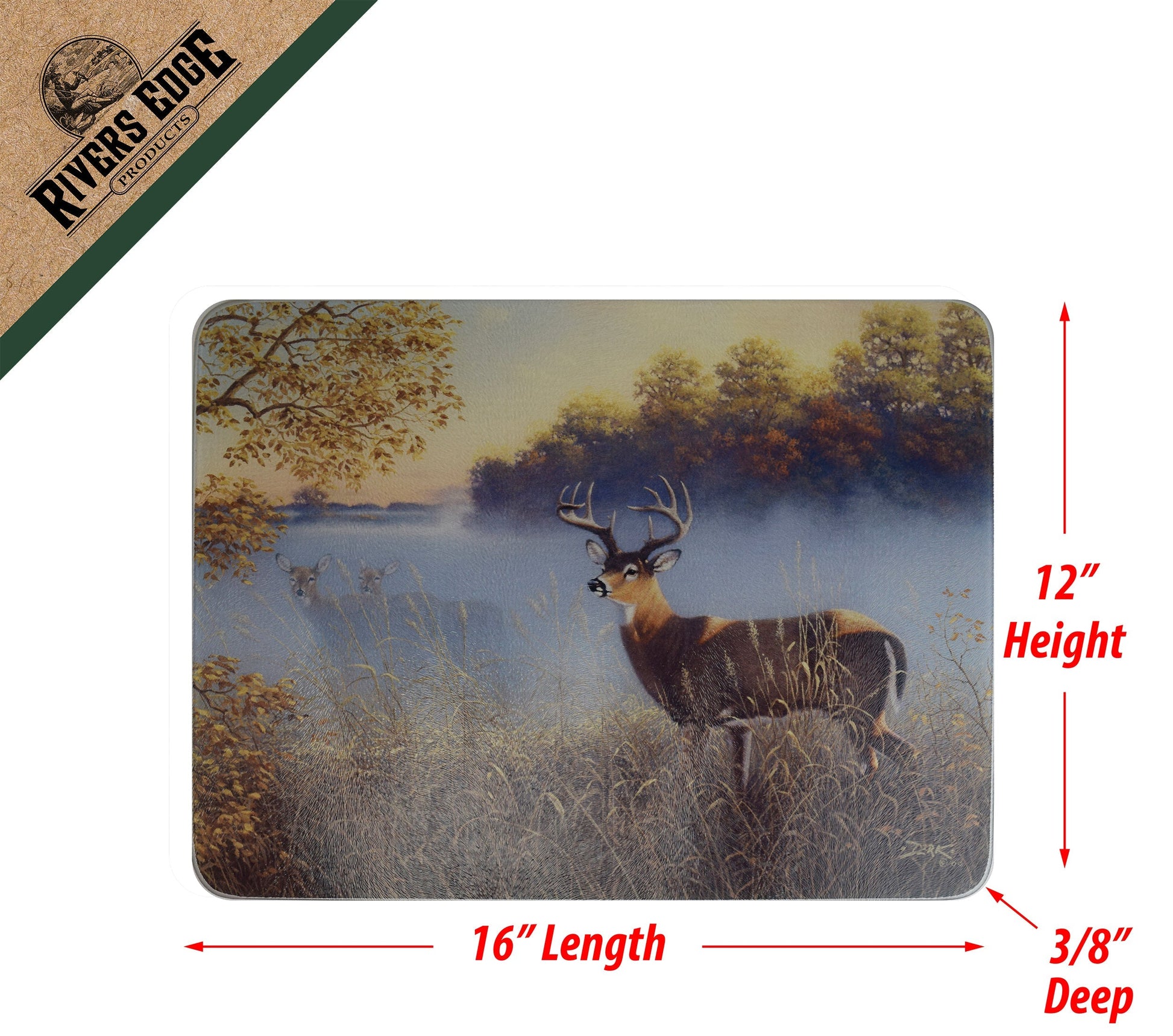 These tempered glass cutting boards from Rivers Edge Products features a buck in the morning fog.