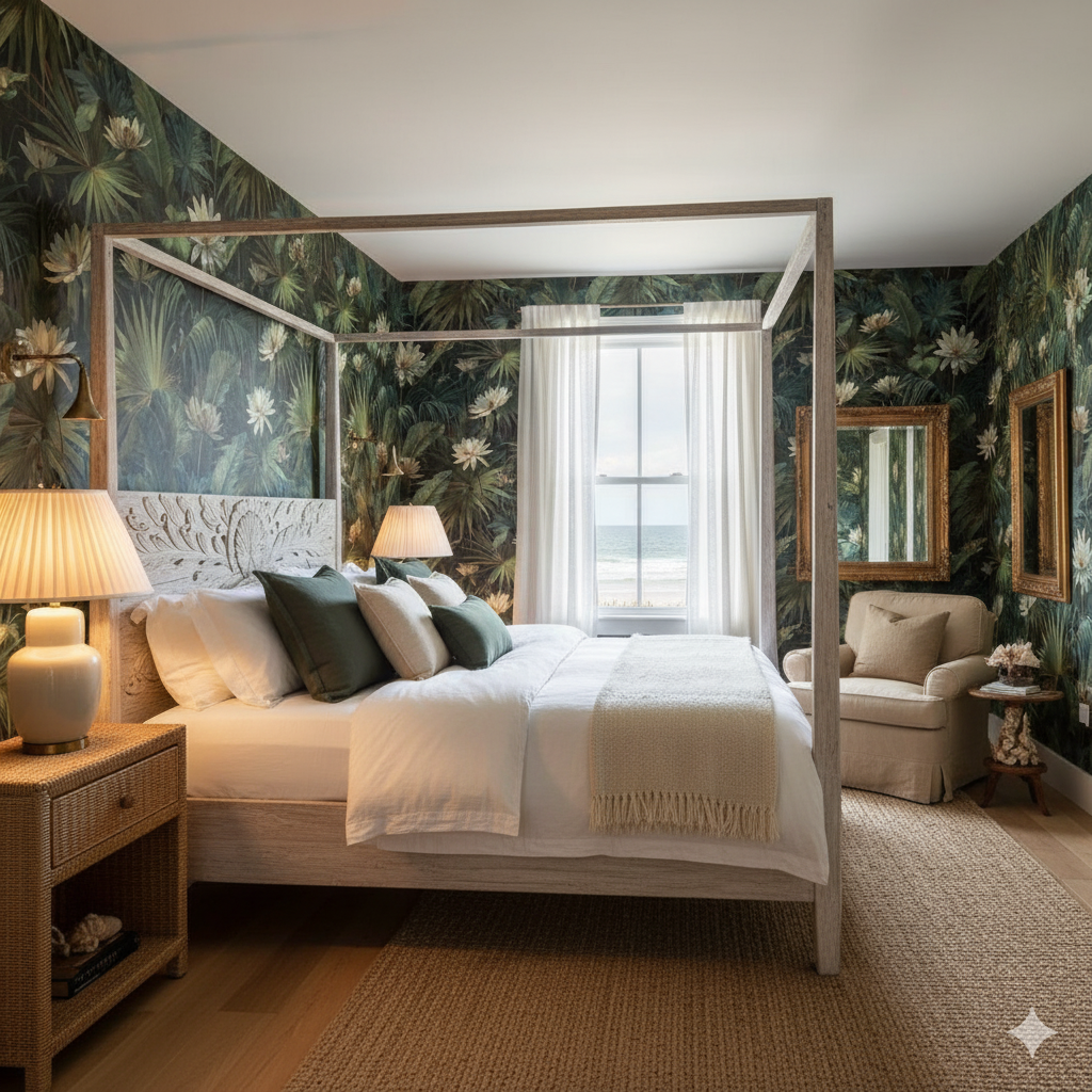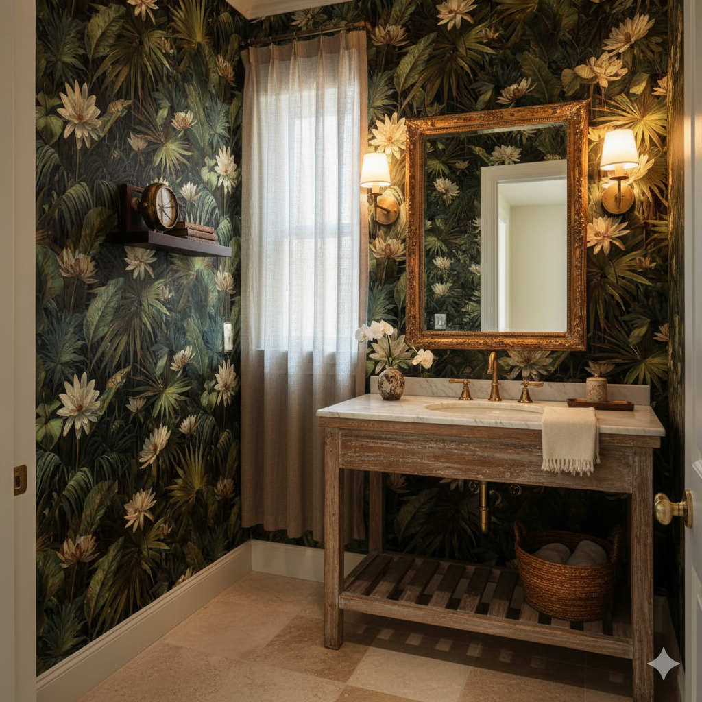Deep greens dominate this lush wallpaper, with fan palms and layered swamp foliage accented by pale yellow water lilies. The rich composition creates an enveloping jungle atmosphere that feels immersive, almost cinematic. Ideal for powder rooms, dining rooms, or dramatic living spaces, it brings a tropical decadence that works well with both dark, moody interiors and natural wood finishes. The intricate leaves and blooms give a painterly realism that is luxurious without being overwhelming, perfect for homeowners seeking a statement piece that feels exotic and grounding at the same time.