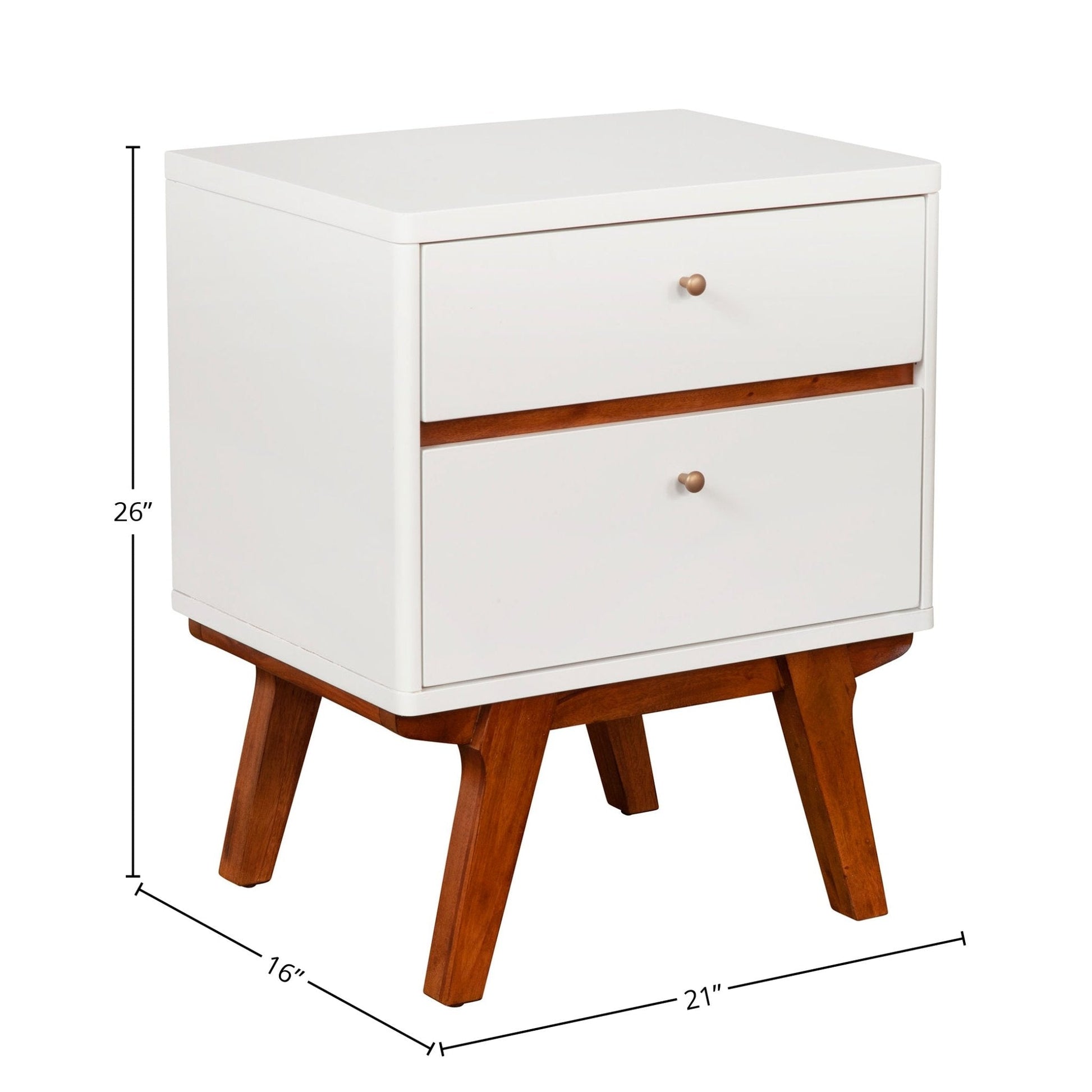 Give your bedroom a stylish and modern, mid-century feel with this clean lined collection. The Dakota two drawer nightstand is structurally sound and constructed with Mahogany wood solids & veneer in a white finish and trendy acorn brown accents. The Dakota collection hints at subtle refinement, without overpowering your current decor. Drawers feature English Dovetail Drawer Construction, felt lined top drawer to protect your valuables as well as metal ball bearing drawer glides The pieces in the Alpine Furniture Dakota collection fluidly fits in with a variety of aesthetics and color schemes to compliment your bedroom setting. Coordinate with other pieces from the Dakota bedroom collection.