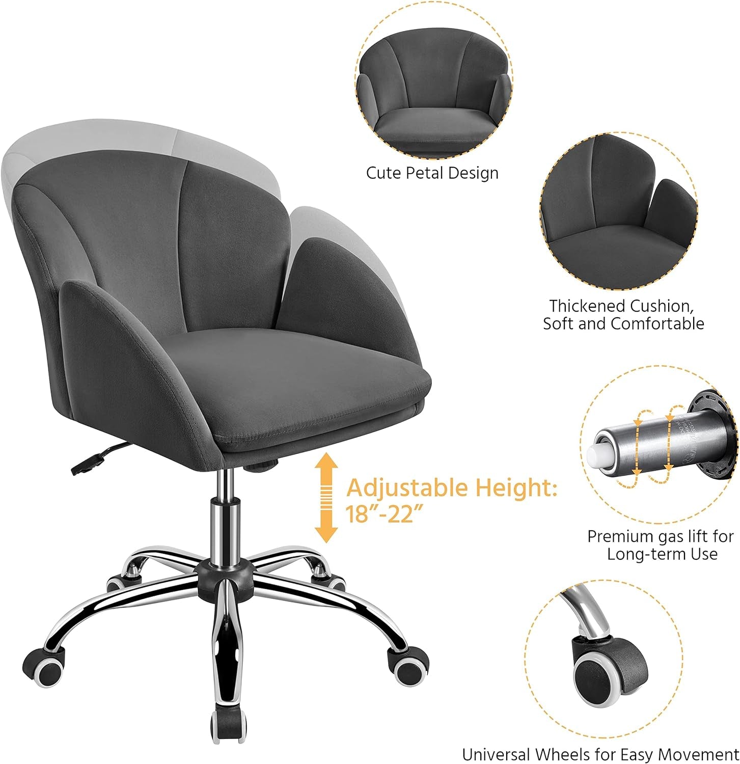 Turn your vanity into a refined sanctuary with a velvet desk chair that pairs luxury with everyday practicality. Our dark gray makeup vanity chair features a plush velvet cover, a petal-shaped backrest, and a sleek chrome base, delivering elegance and support for your beauty routines and desk tasks.