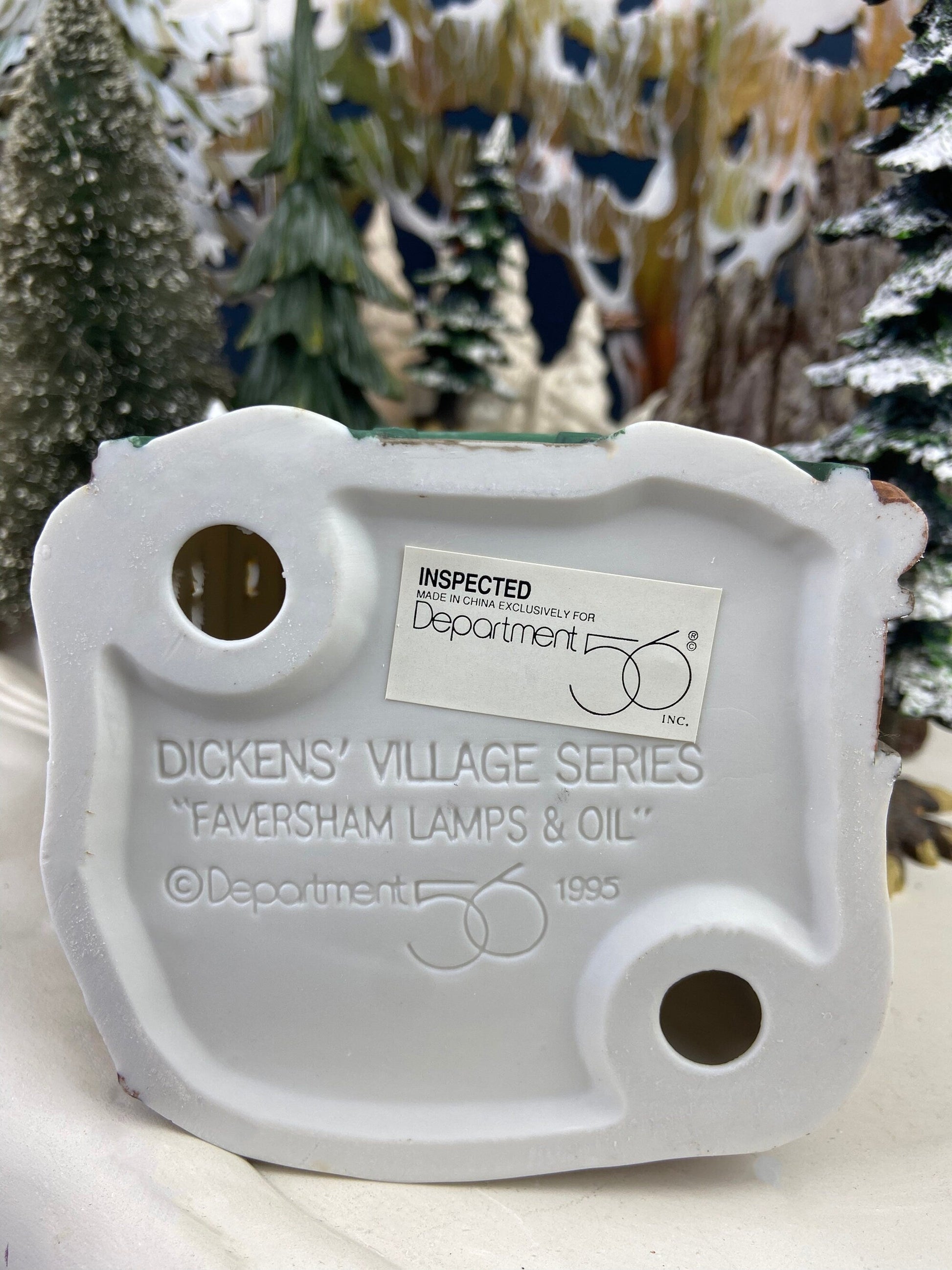 Department 56 Illuminated Christmas Village House. Faversham Lamps & Oil. Wicking, Coal, Whale Oil, Glass Chimneys. Dicken's Village Series. Light Kit Included. Free-standing Islands, Trees, and Accessories are not Included in the price.