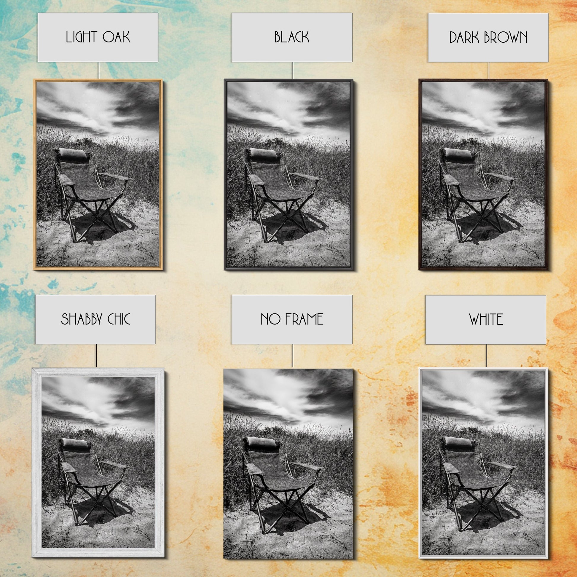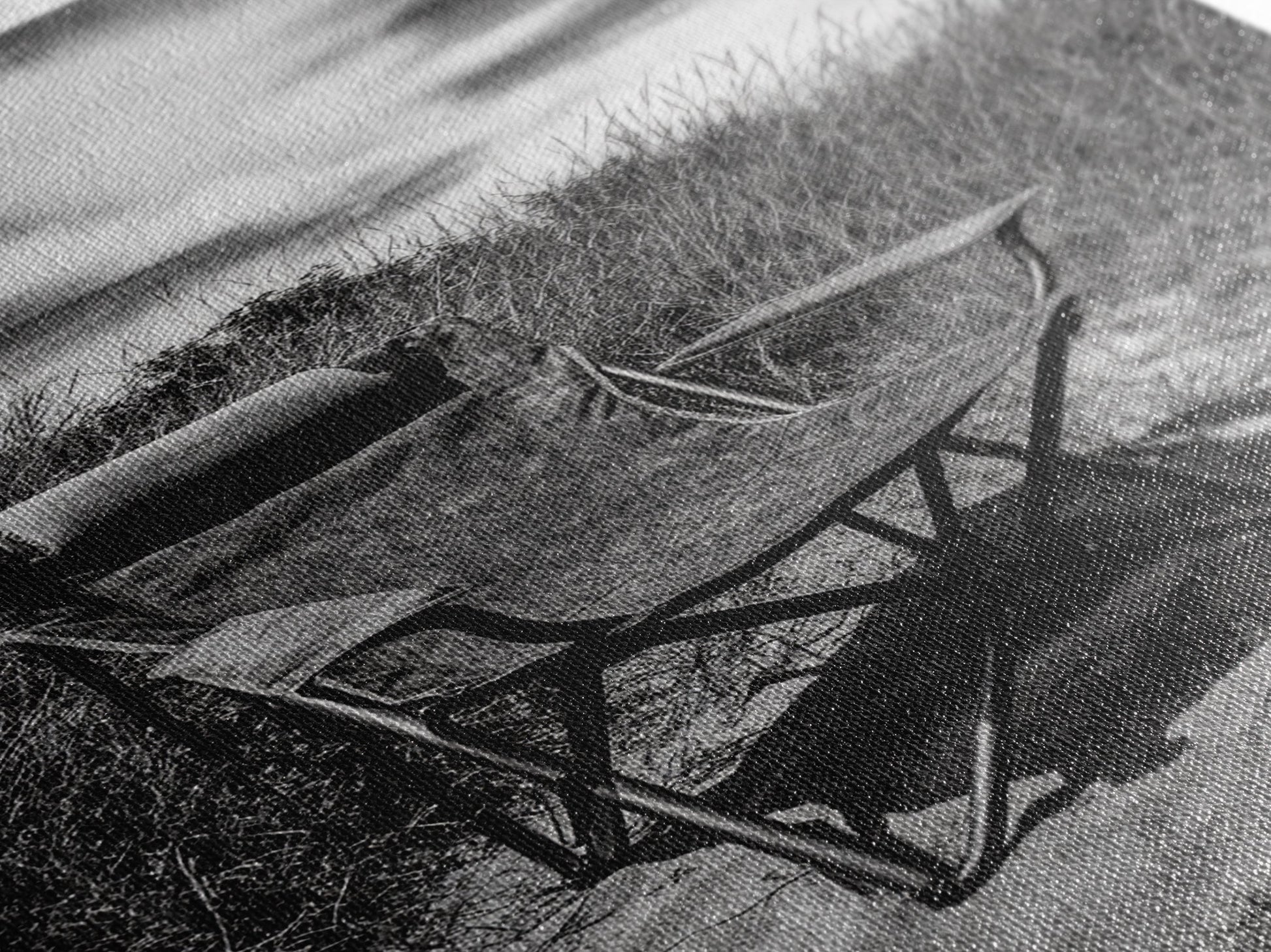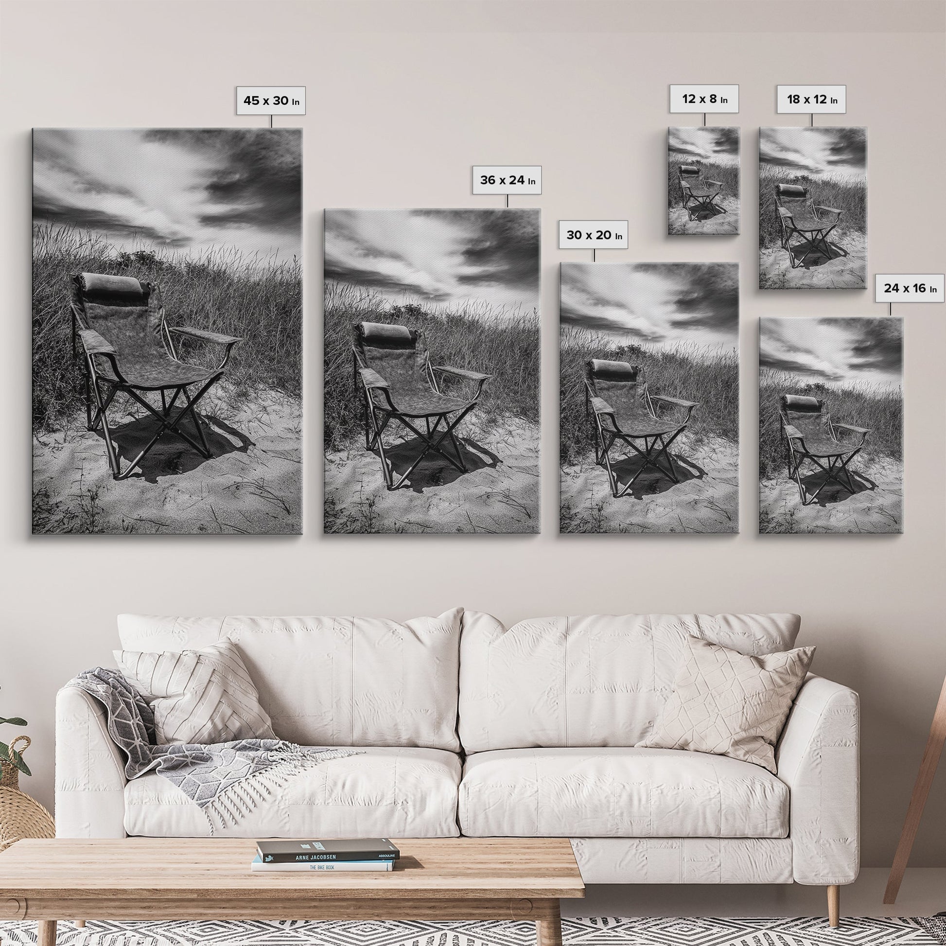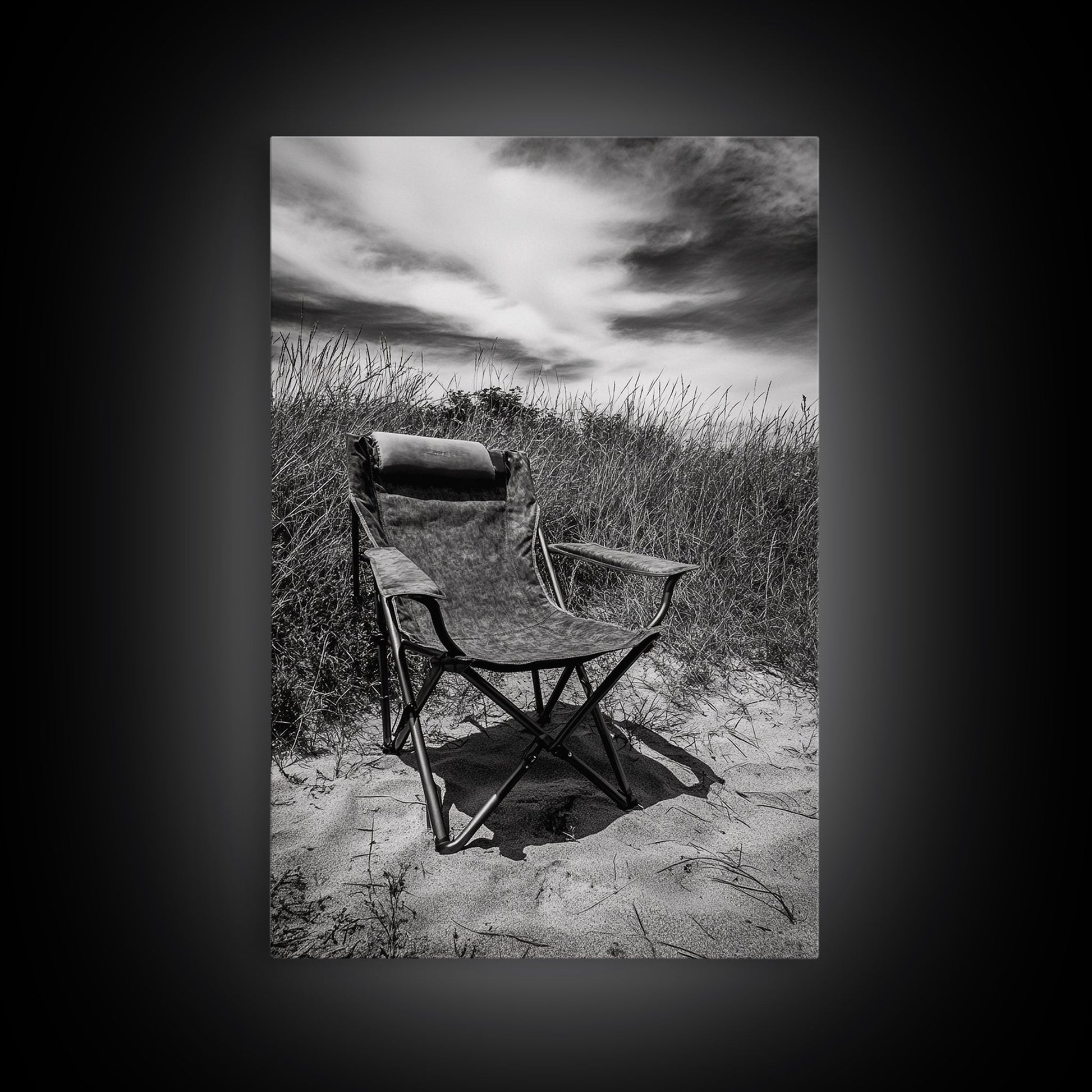 Deserted beach chair, quiet coast vibes, windswept scene, peaceful solitude, Canvas Print, hallway decor, rustic retreat outdoor artwork