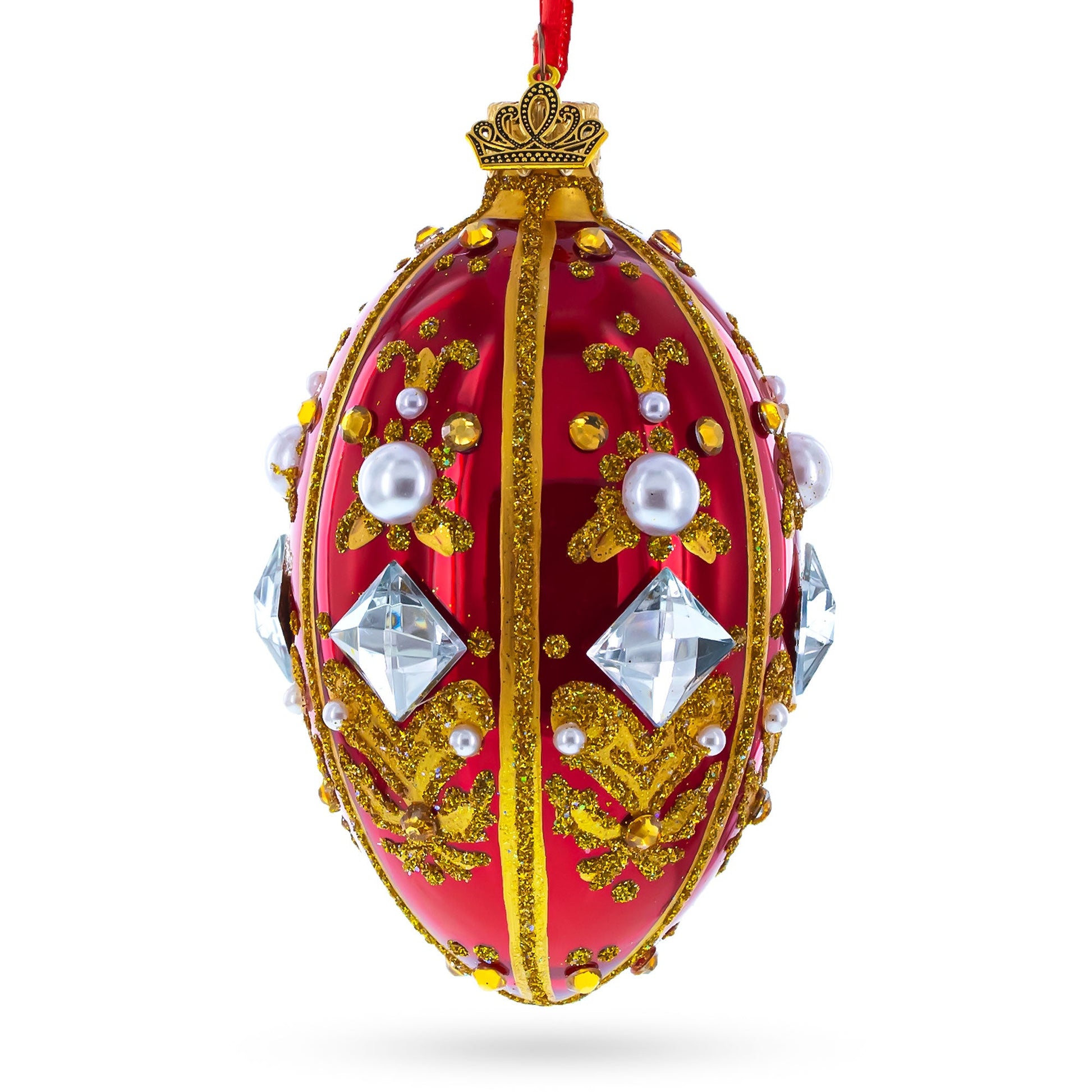 Diamonds and Pearls on Red Glass Egg Ornament 4 Inches