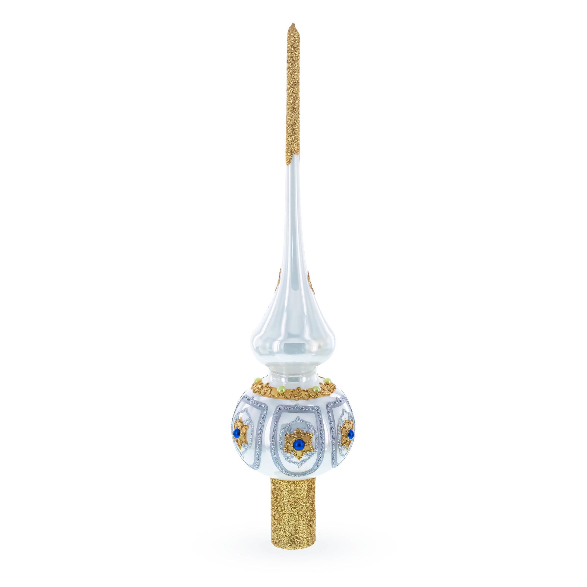 Dimensional Blue and Red Jewels on Silver Glass Christmas Tree Topper 11 Inches
