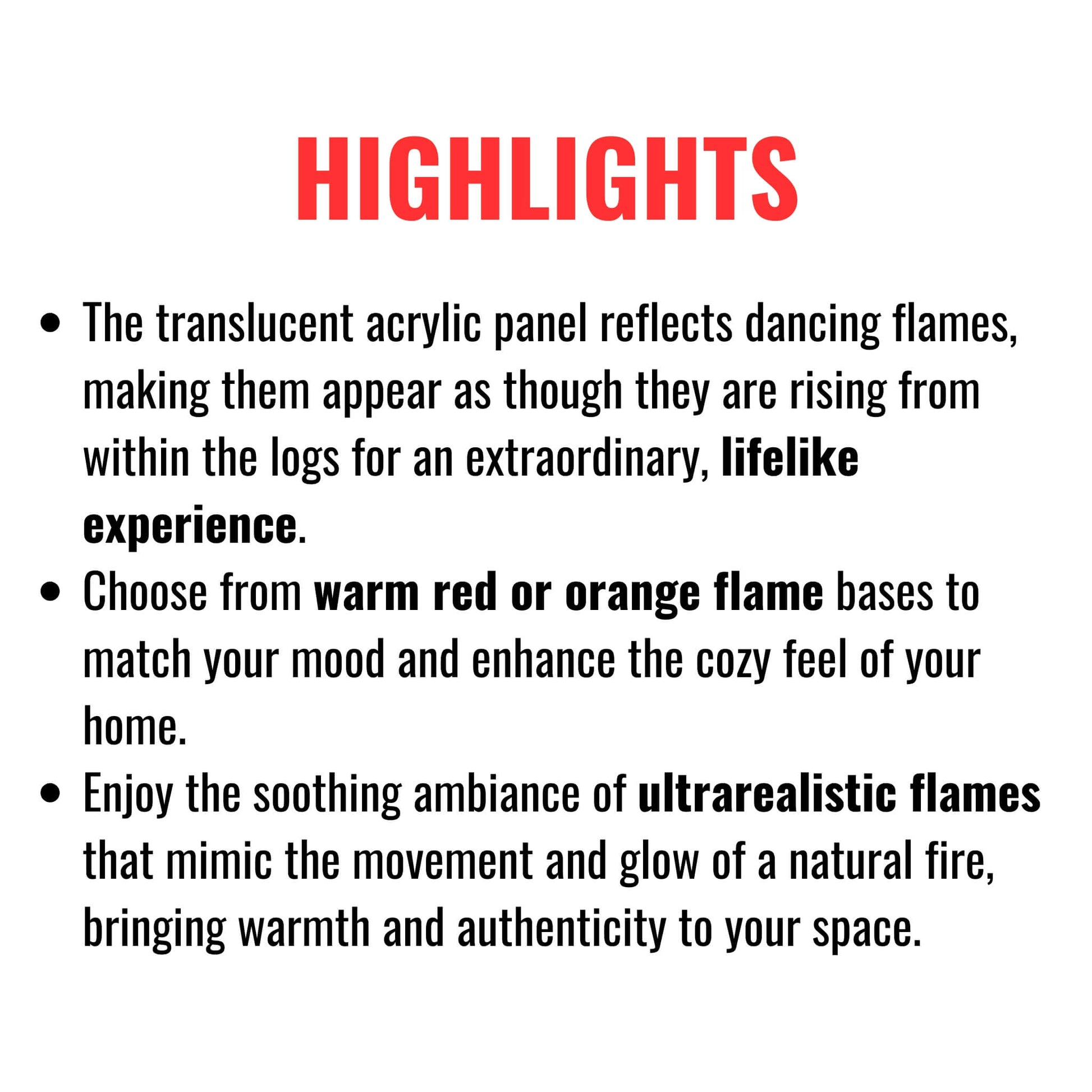 - Experience the meticulous details of Revillusion®. The handcrafted Realogs, meticulously molded from real wood logs, feature an inner glowing LED light that pulsates like real burning embers, creating a truly immersive and authentic fireplace experience.