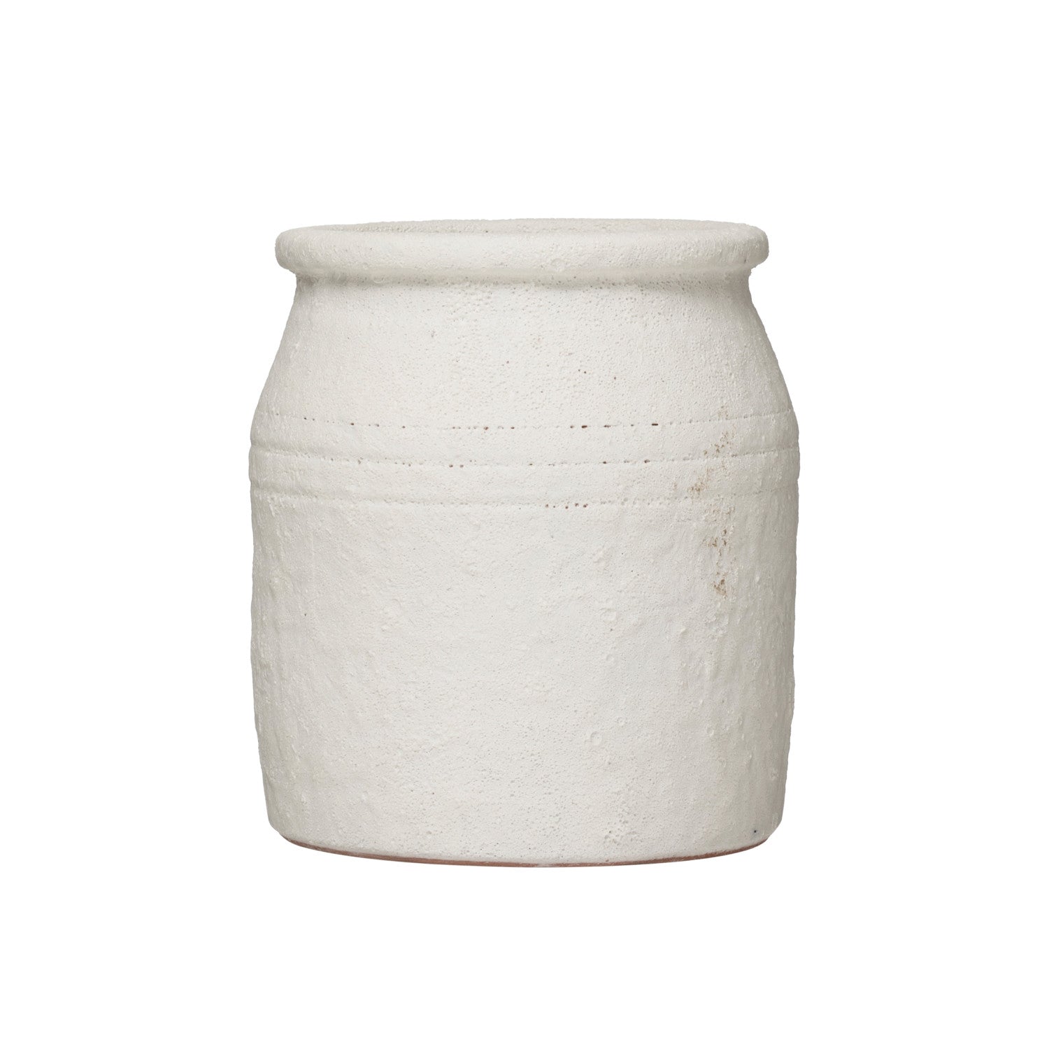 This white terra-cotta crock with volcano glaze will add style and personality to any home. This crock is a beautiful piece that features a terra-cotta body with a white volcano glaze that creates a textured and crackled look. The glaze has a matte and rough surface that contrasts with the smooth and glossy terra-cotta. This crock is made of high-quality terra-cotta that is durable and sturdy. The volcano glaze is a technique that involves applying a thick layer of glaze to the pottery before firing, resulting in a bubbled and crackled surface that resembles volcanic rock. Each crock will vary slightly due to the nature of the technique, making it a unique and one-of-a-kind piece. This crock measures 6.25 inches in diameter and 7 inches in height. Whether placed on a countertop, a table, or a shelf, this crock will surely enhance the home décor with its rustic charm.