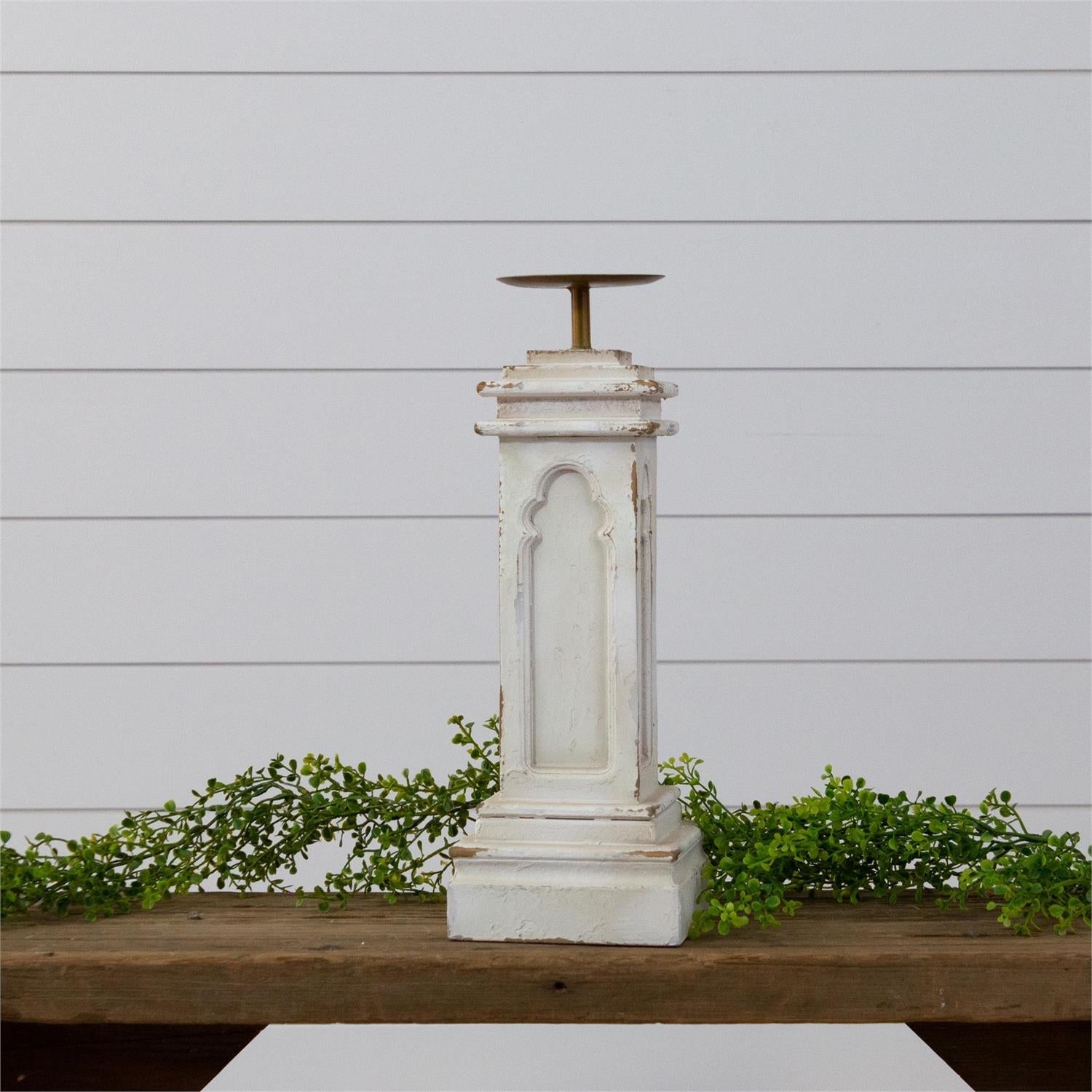 A timeless addition to any space, this distressed wood column candle holder blends vintage-inspired charm with classic elegance. The carved column base features an antique white finish with intentional distressing, adding character and warmth to your décor. Topped with a brass plate, this holder provides a stable surface for pillar candles, making it a stunning centerpiece for mantels, dining tables, or accent displays.
