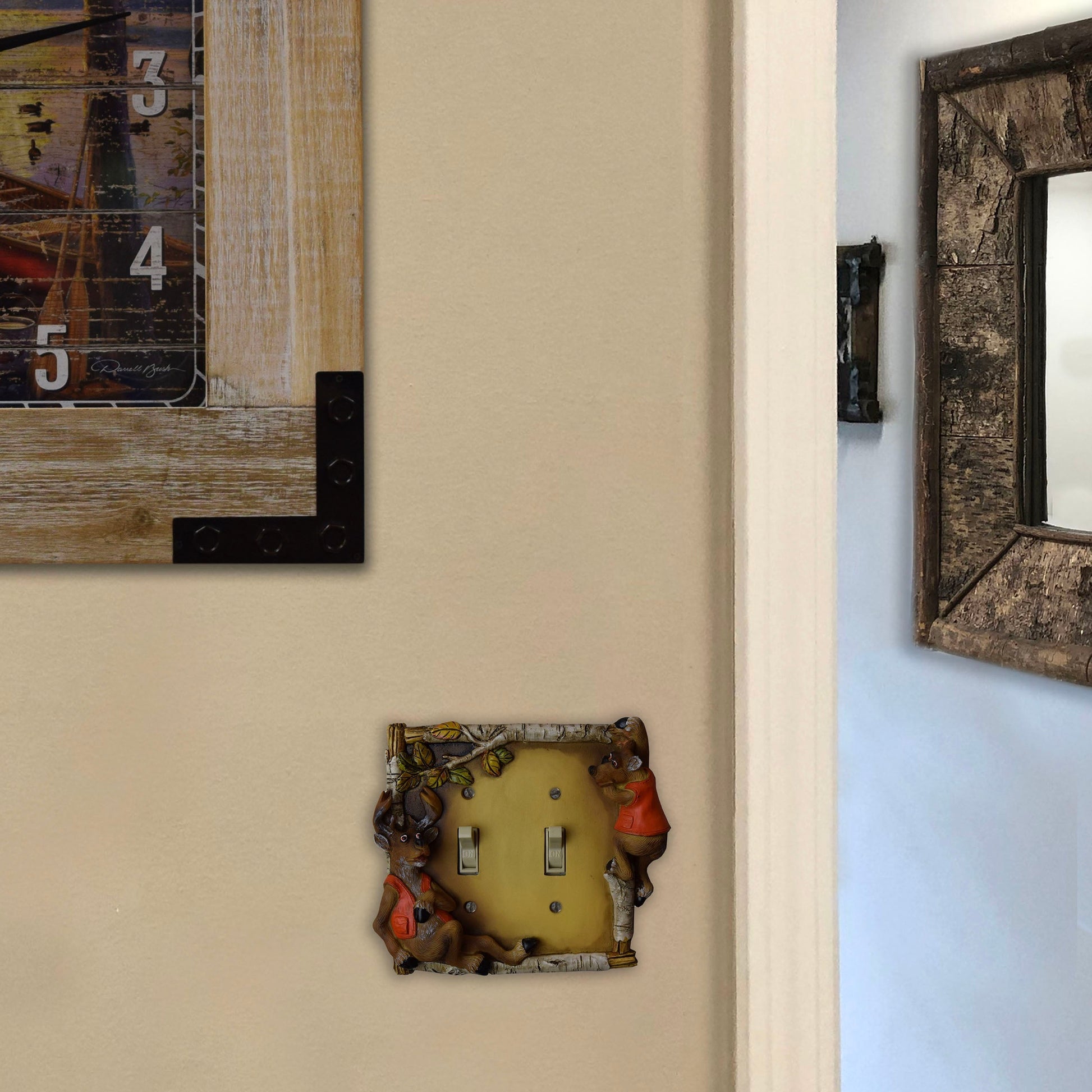 This double switch plate cover from River's Edge Products is the ideal accent to complement hunting-themed decor. Features two humorous bears in hunting vests with a birch branch border and yellow background. Match this with our other playful deer wall plate covers to complete your hunting themed decor.