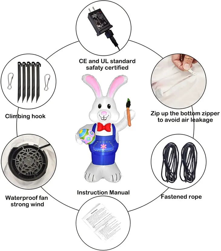 - With illustrated instructions on the package and an additional instruction booklet in the box, rejoice when your Easter outdoor inflatable explodes instantly. Each Easter Bunny features 3 built-in fixed sandbags for stability and easy-deflate technology with a zipper system on the back for quick and easy storage.