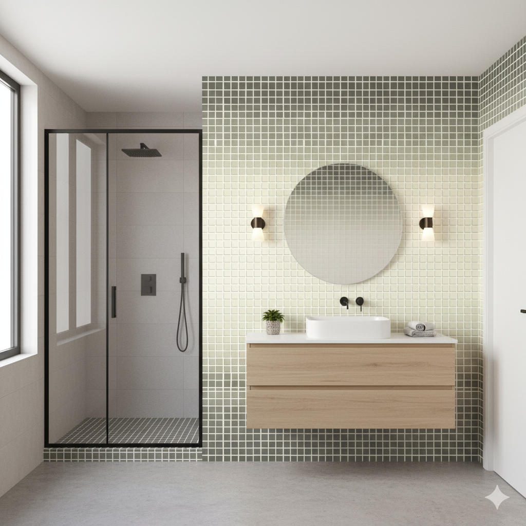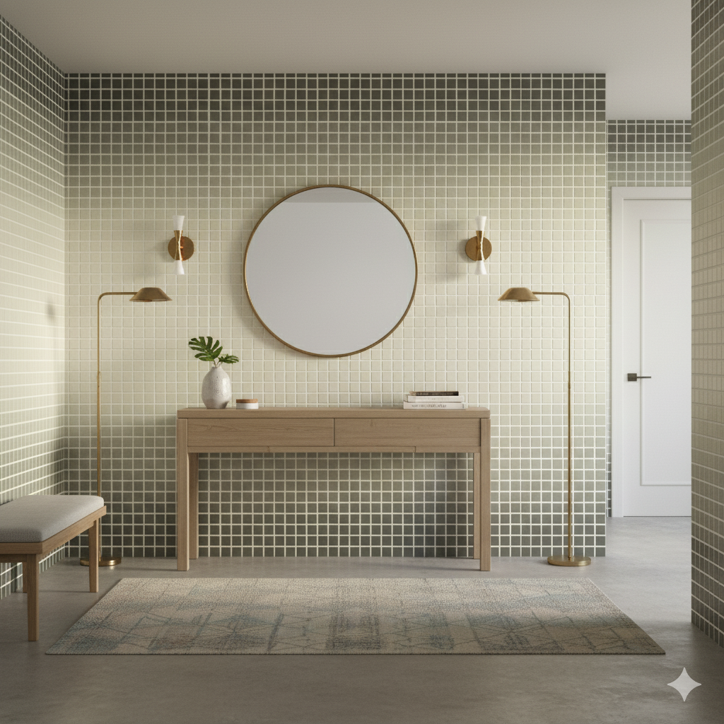 This gradient mosaic tile effect transforms from deep charcoal into airy cream, as though light is slowly filtering through fog or dawn breaking across the horizon. Each hand-drawn square retains a gentle wobble that avoids rigid perfection, lending it an artisanal quality instead of sterile geometry. The shifting tonal range makes this wallpaper incredibly versatile — modern enough for minimalist bathrooms or kitchens, yet soft enough for a transitional living room or office. Against metallic finishes or natural stone, the effect is striking, creating a sense of rhythm and subtle movement across the walls.