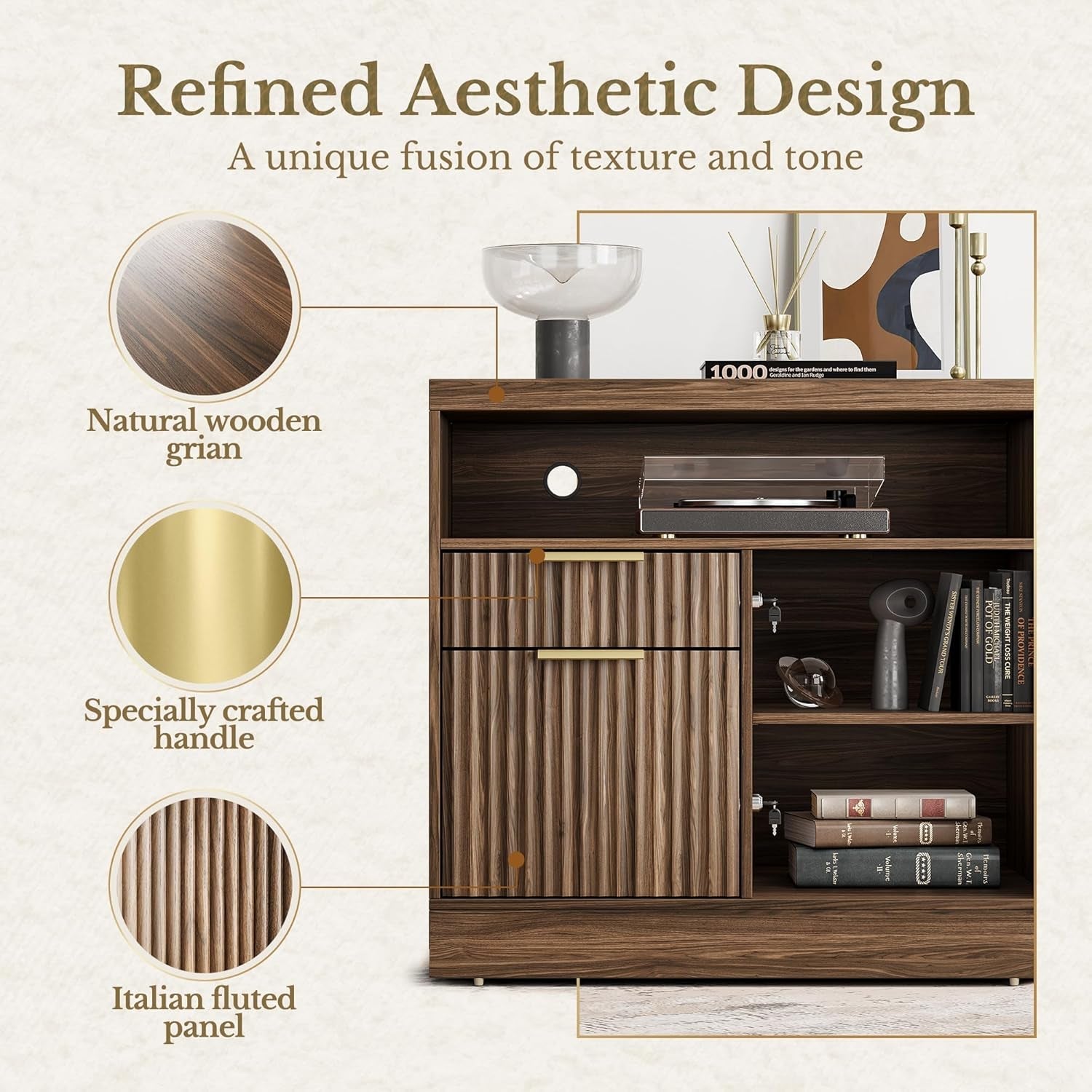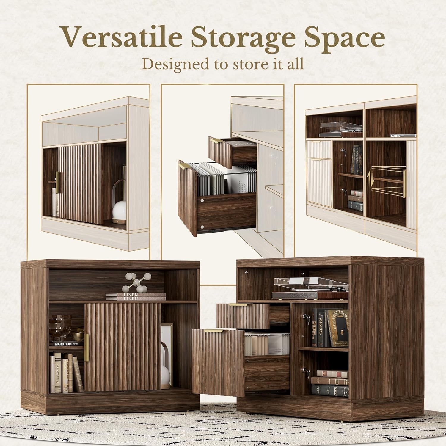 - Integrated storage system: Two sleek file cabinets keep everyday items close at hand; dual-format rails fit both A4 and Letter-size documents, with room for a printer or speakers on the surface.