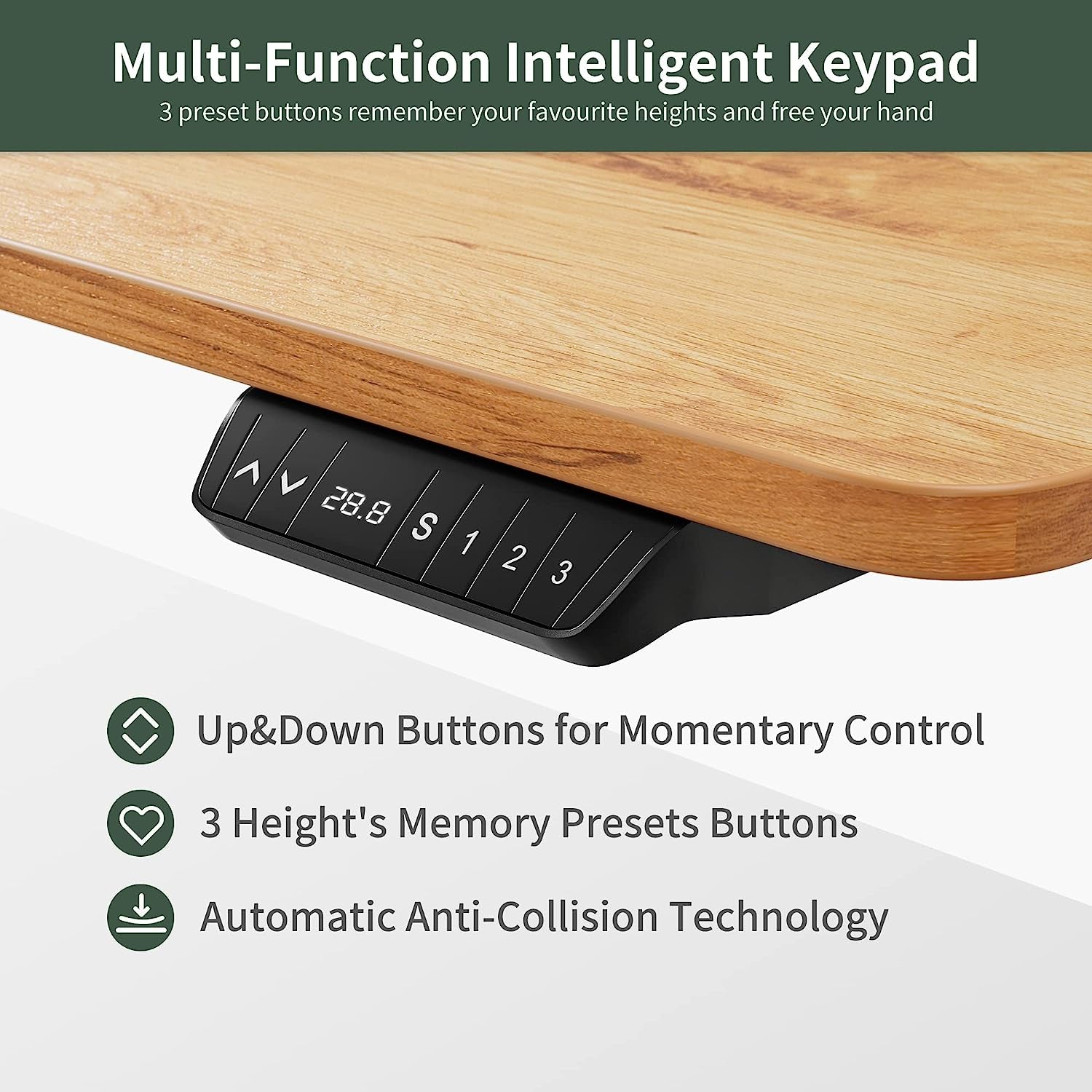 - Anti-collision technology: built-in sensor detects obstacles in the desk’s path to protect you and your equipment from bumps.