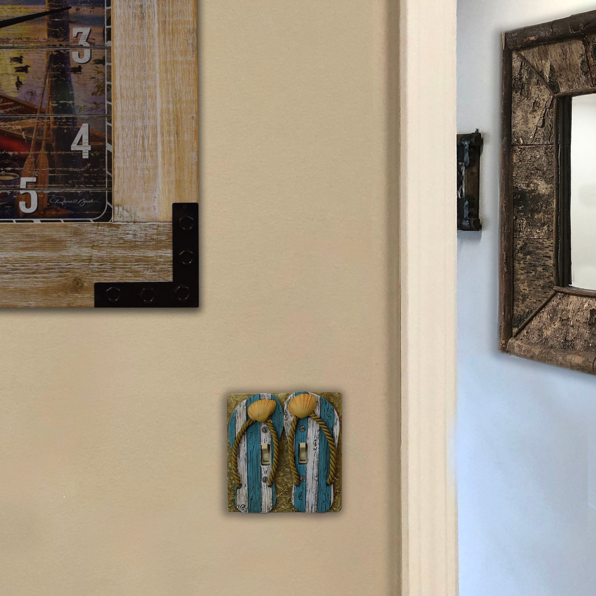 This double switch plate cover from Rivers Edge Products is the ideal accent to complement beach-themed decor. Features two blue and white beach sandals with a scallop shell over a sand textured background. Match this with our other coastal beach themed wall plate covers to complete your seaside decor.